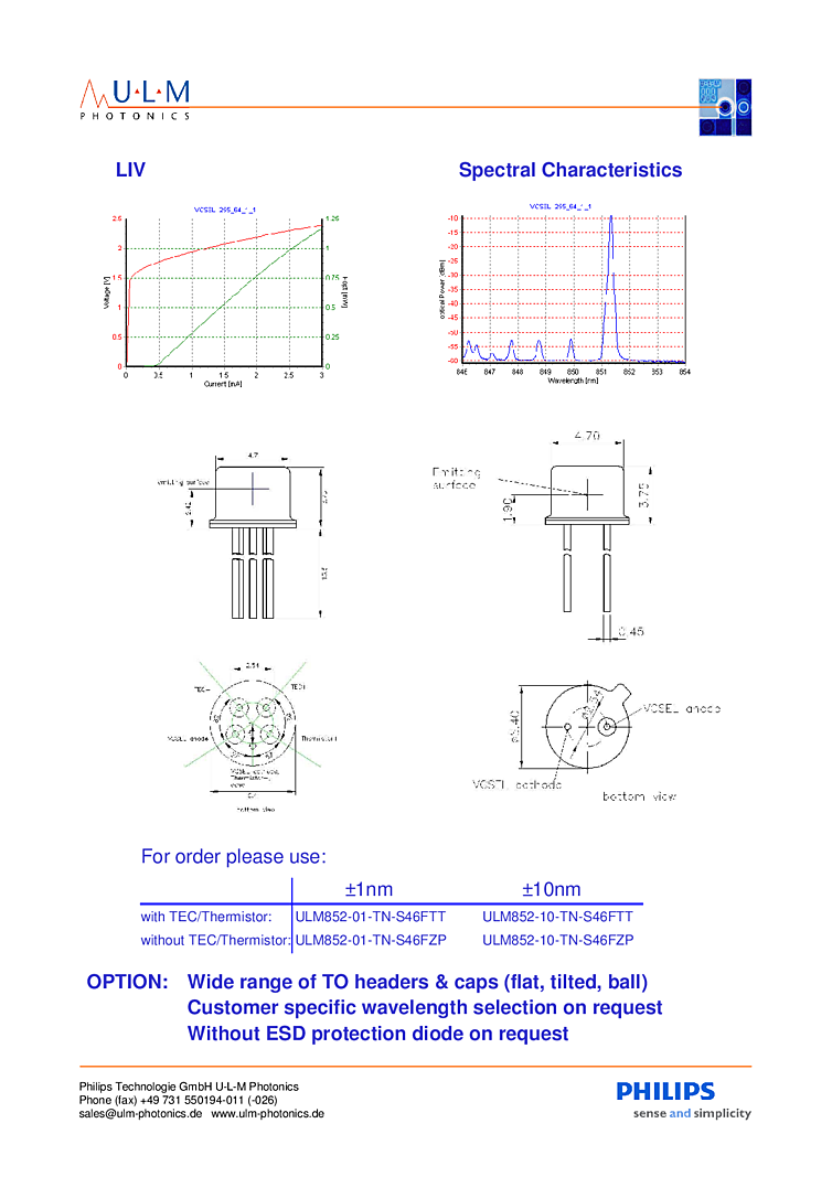 852nm The VCSEL laser data sheet attached (Vertical Cavity Surface-Emitting Laser) references an internal TEC, dthermistor, as well as an ESD protection diode. This VCSEL is a narrow linewidth device with 2 nm tunability with TEC. High performance and reliability are key features of this device.