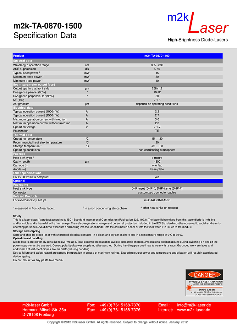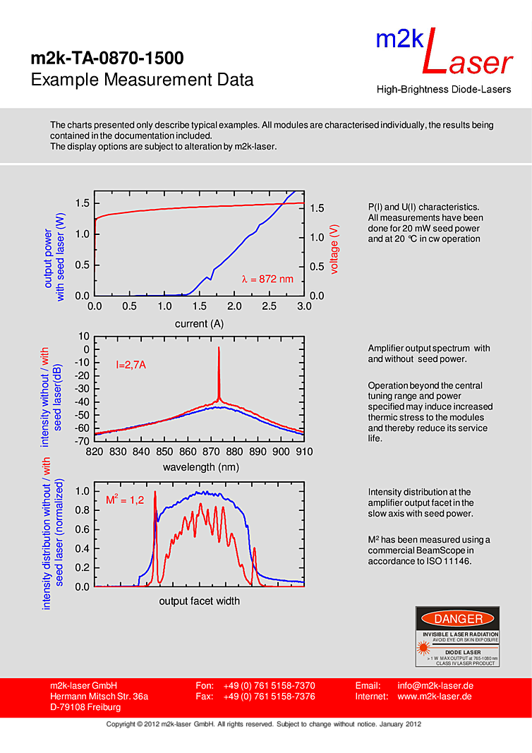 865nm-880nm from m2K lasers tapered amplifier. GaAs based tapered amplifiers are used for the amplification of an existing seed laser. The seed power between 10 mW and 30 mW can be amplified up to nearly diffraction limited power values of 1500 mW. Key features referenced on the attached data sheet include operation range: 865nm – 880nm