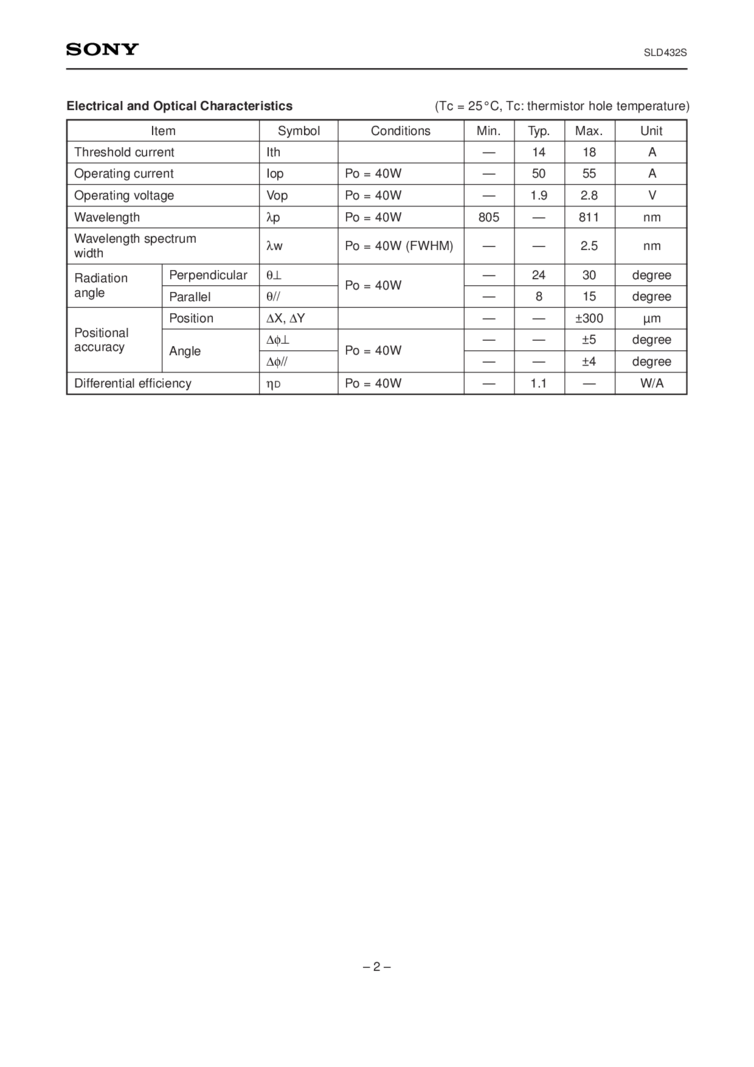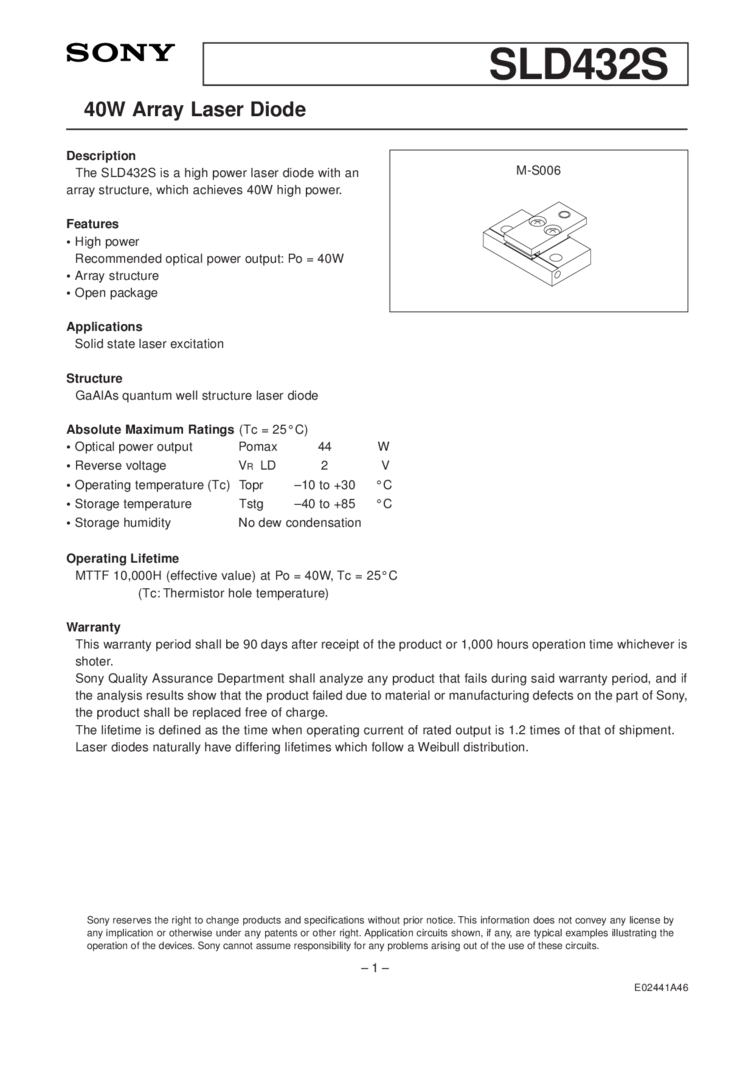 Feature offered include optical power output of 40W, an high power laser array structure in an open package. Applications referenced include solid state laser excitation. The structure is a GaAlAs quantum well structure laser diode. Operating Lifetime is specified at MTTF 10,000H.