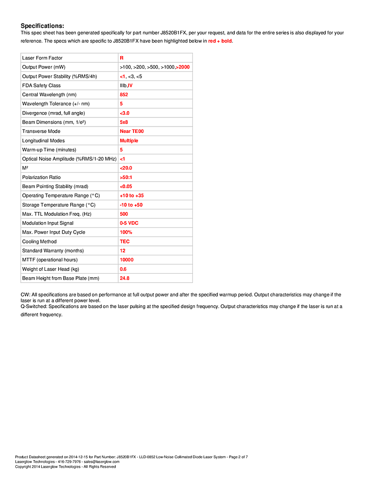 The LLD-0852 Laser Glow Technologies Series of Low-Noise Collimated Diode Lasers are ideal for applications requiring less than 1% noise and output power levels from 100 mW to 2 W. These 852 nm NIR lasers maintain a high level of long-term output power stability and long operating lifetime at an aggressively competitive cost. These lasers are commonly used for fluorescence excitation, PIV, Raman Spectroscopy, and a broad spectrum of other applications. The driver is