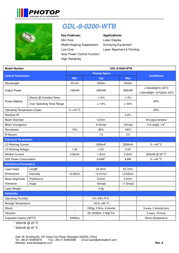 波長: 532nm-532nm 出力: 200mW-200mW パッケージ: TO-can テクノロジー: green laser diode