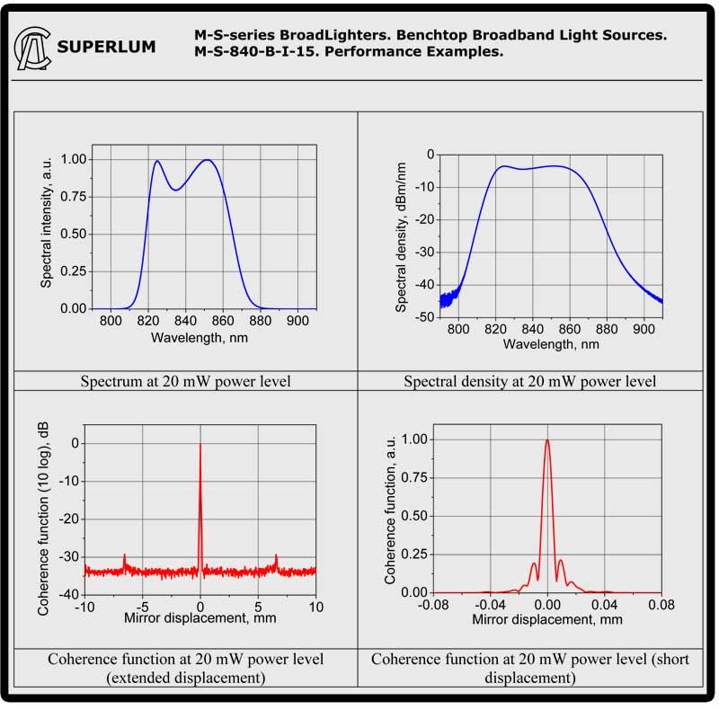 This 840nm, 20mW (typical) broadband light source from Superlum is a high-power, wide spectrum and low coherence AC powered benchtop light source. This source is based on a single-mode fiber coupled superluminescent diode modules (SLD) manufactured by Superlum. These broadband light sources have an integrated optical isolator to protect the SLD from optical feedback. Users can control key parameters of these light sources using a fully featured front panel interface or remotely through USB or a TTL trigger.