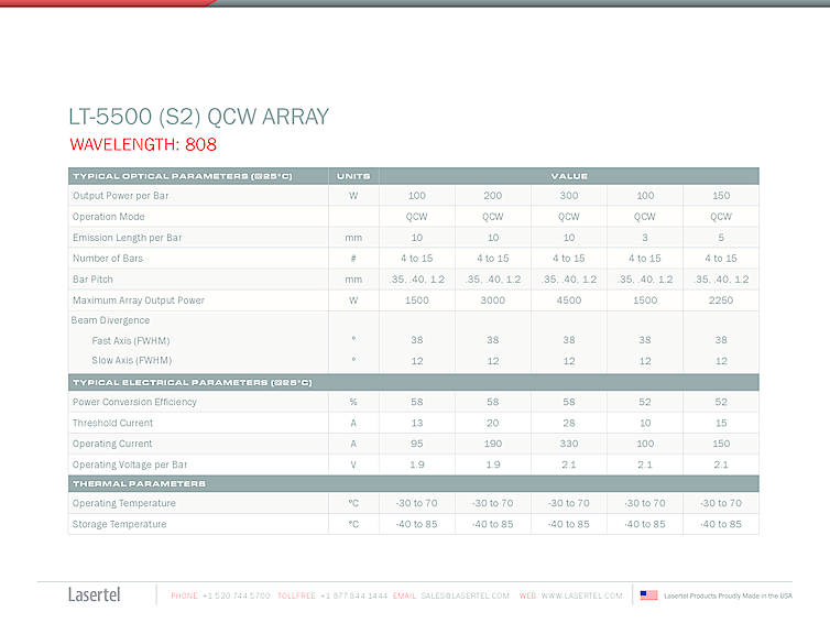 波長: 808nm-976nm 出力: 300W-300W パッケージ: QCW, array, S2 テクノロジー: high power array