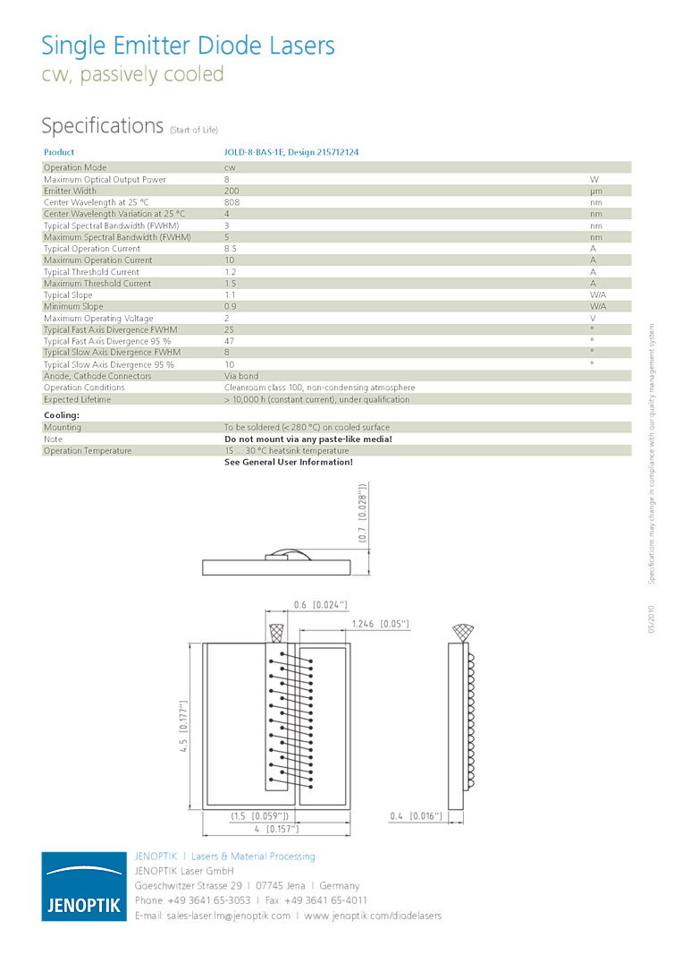 波長: 808nm-808nm 出力: 8000mW-8000mW パッケージ: COS テクノロジー: high power single emitter