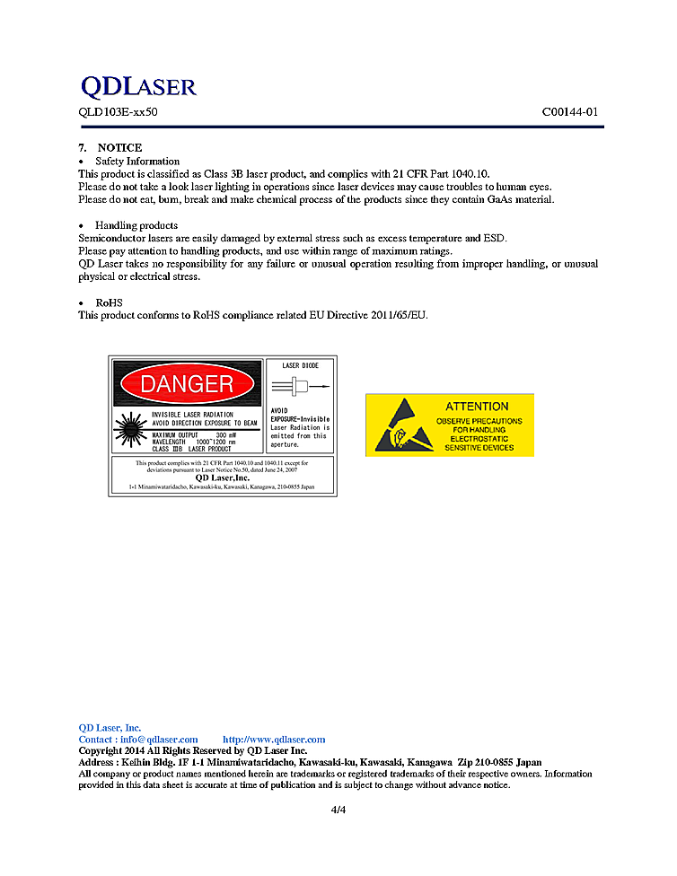 1064nm laser diode with >50mW output power from QDLaser. This distributed feedback (DFB) laser is suitable for various applications, such as seeder, measurement, sensing, frequency doubling and etc. The laser is mounted into a TO-56 header including a monitor PD for optical power control and hermetic sealed with a flat type cap.