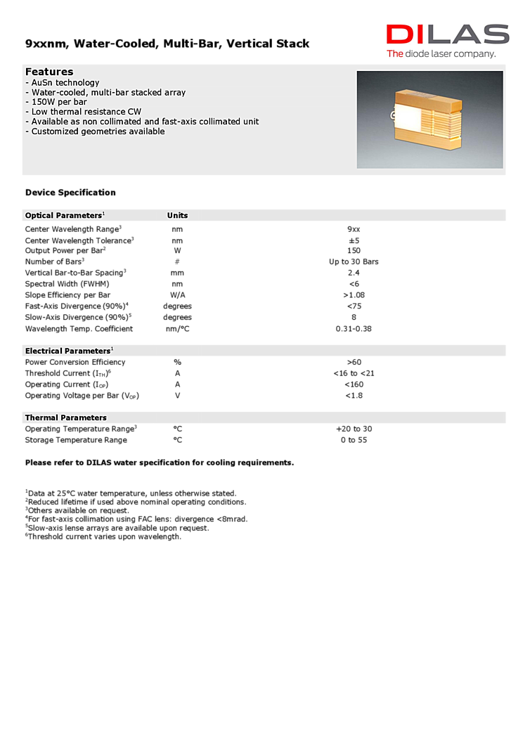 915nm, 980nm 915 nm and 980 nm Lasers are water-cooled, multi-bar vertical stacks from DILAS. Features include AuSn technology, multi-bar stacked array, 150 Watts per bar, low thermal resistance, CW mode, and available as non-collimated and fast-axis collimated unit.
