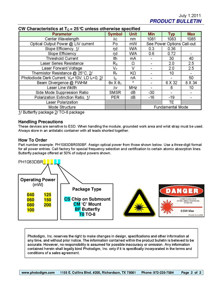 波長: 1083nm-1083nm 出力: 200mW-200mW パッケージ: COC, TO-can, c-mount, BTF テクノロジー: DBR