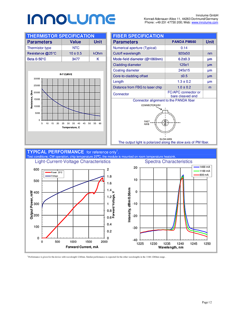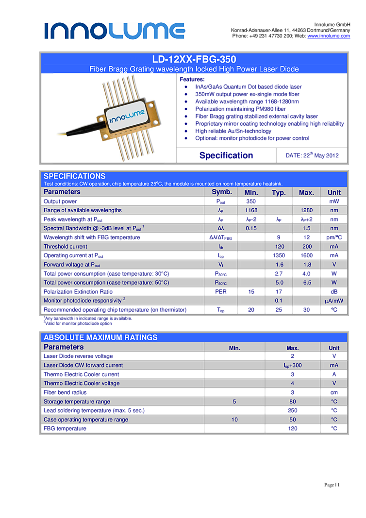 1168nm-1280nm Innolume laser diode is an InAs/GaAs Quantum Dot based diode laser with 350mW output power ex-single mode fiber, available wavelength range 1168nm-1280nm. Polarization maintaining PM980 fiber and fiber Bragg grating and this device is a stabilized external cavity laser. Other features include a proprietary mirror coating technology