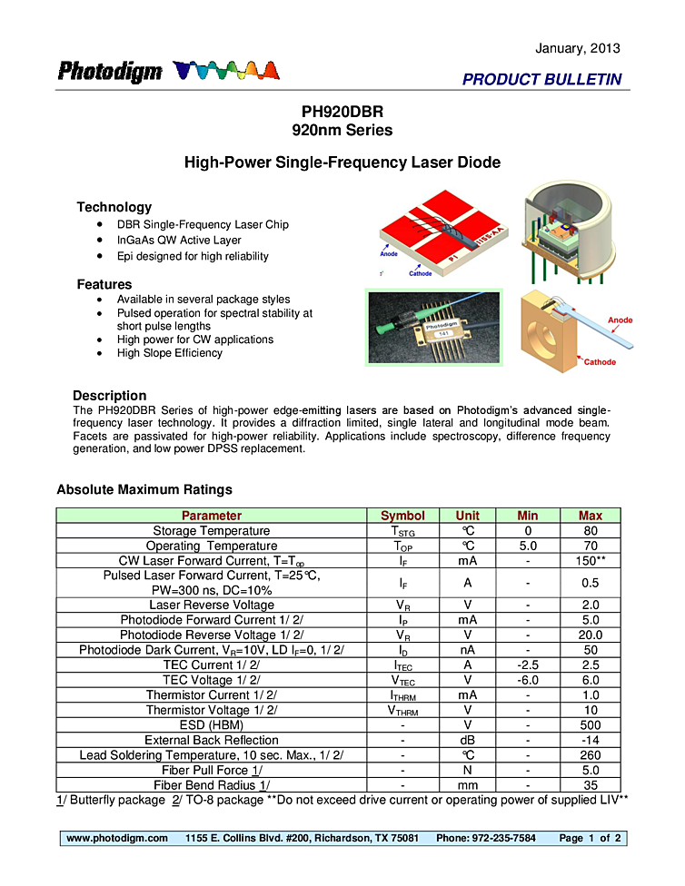 波長: 920nm-920nm 出力: 120mW-120mW パッケージ: COC, TO-can, c-mount, butterfly テクノロジー: DBR