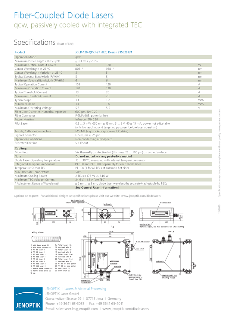 波長: 938nm-938nm 出力: 120W-120W パッケージ: fiber coupled module テクノロジー: QCW, passively cooled
