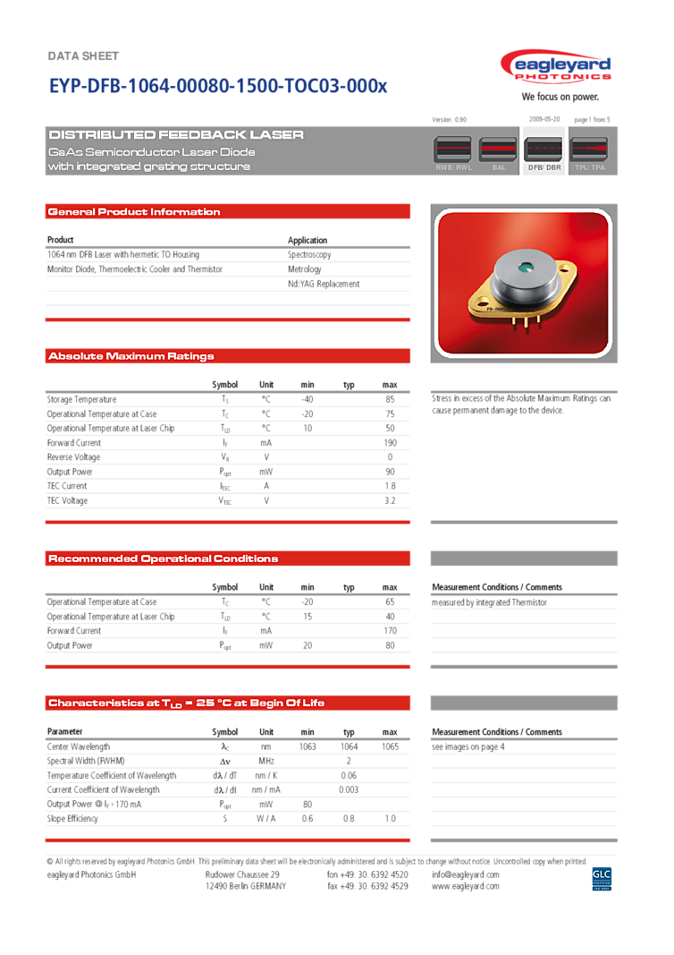 波長: 1064nm-1064nm 出力: 90mW-90mW パッケージ: TO-can テクノロジー: DFB Laser Diode
