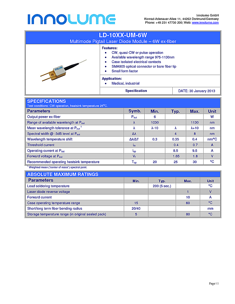 波長: 1060nm-1120nm 出力: 6000mW-6000mW パッケージ: 2-pin-fiber-coupled-module テクノロジー: High Power