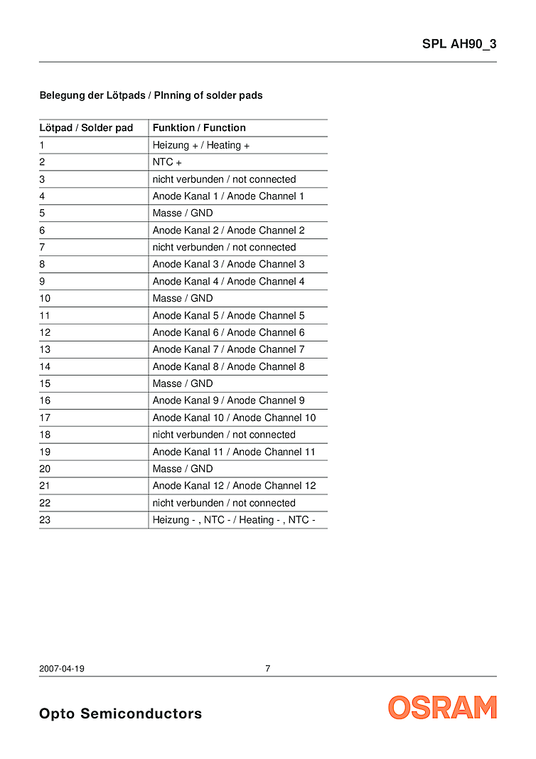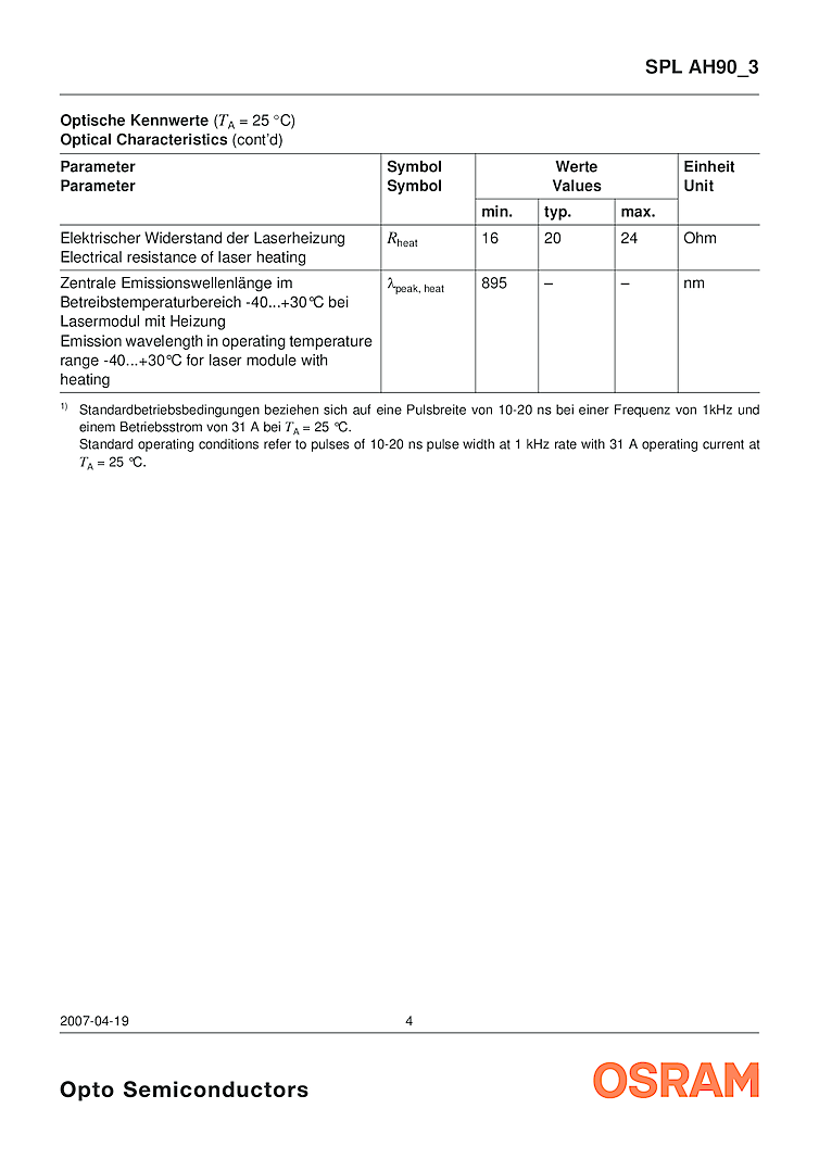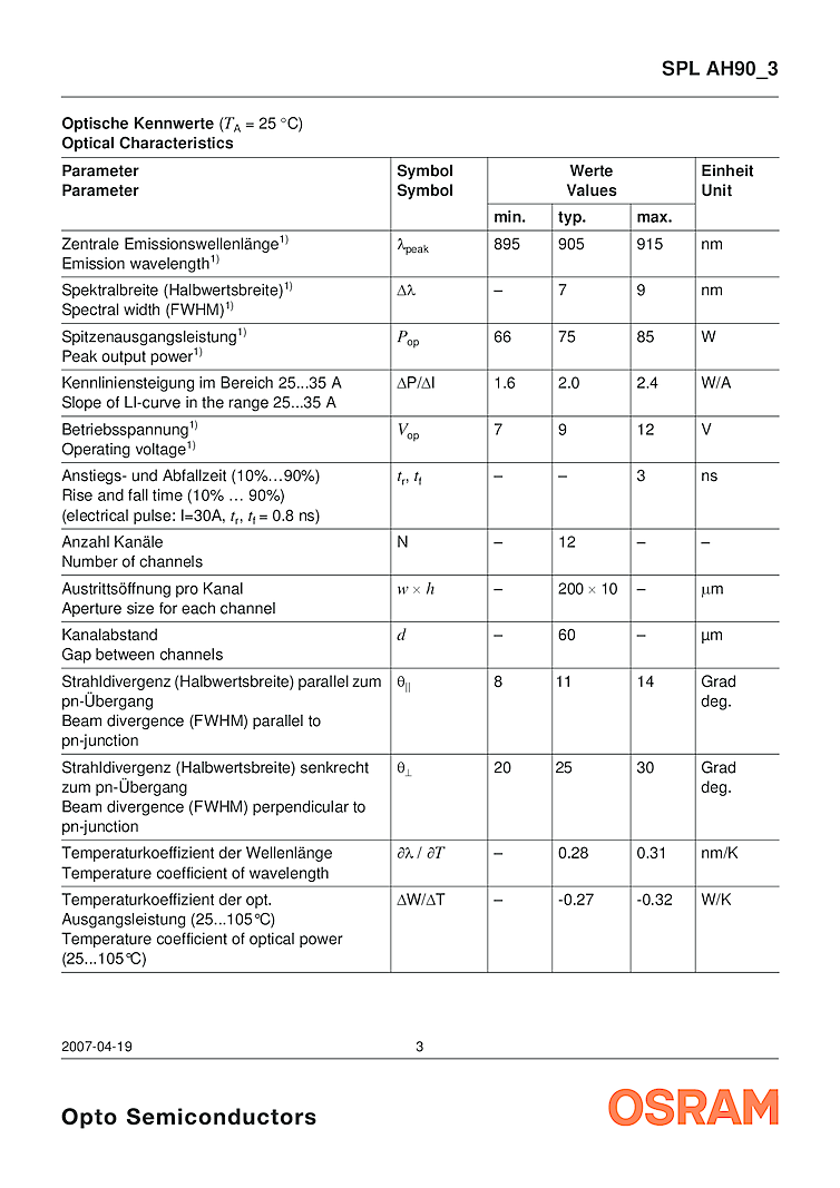 905nm Features of this Osram laser incldude: 12 individually addressable pulsed lasers, monolithic laser die with 260 μm channel pitch, aperture of each laser channel 200 μm × 10 μm, nanostack laser technology including multiple epitaxially stacked emitters. Also, optical peak power up to 75 W per laser at laser wavelength 905 nm. AR-coated glass window with integrated heater for wavelength stabilization and operating temperature range -40 to +105°C.