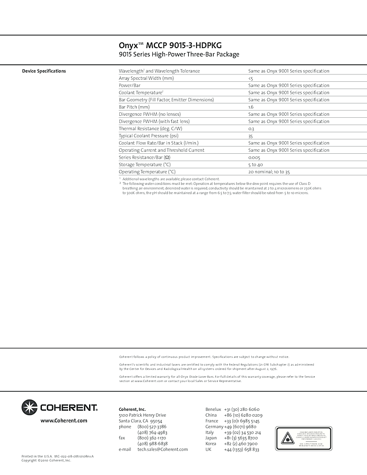 975nm Features described in the data sheet for the Coheren 300W laser bar include a 1.6 mm bar pitch and an 11 mm array width. Additionally, 0.5 degree fast axis collimation (optional) and minimum package width for high-density, two-dimensional arrays is referenced.