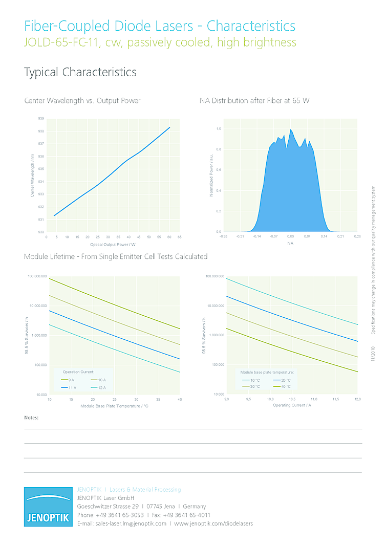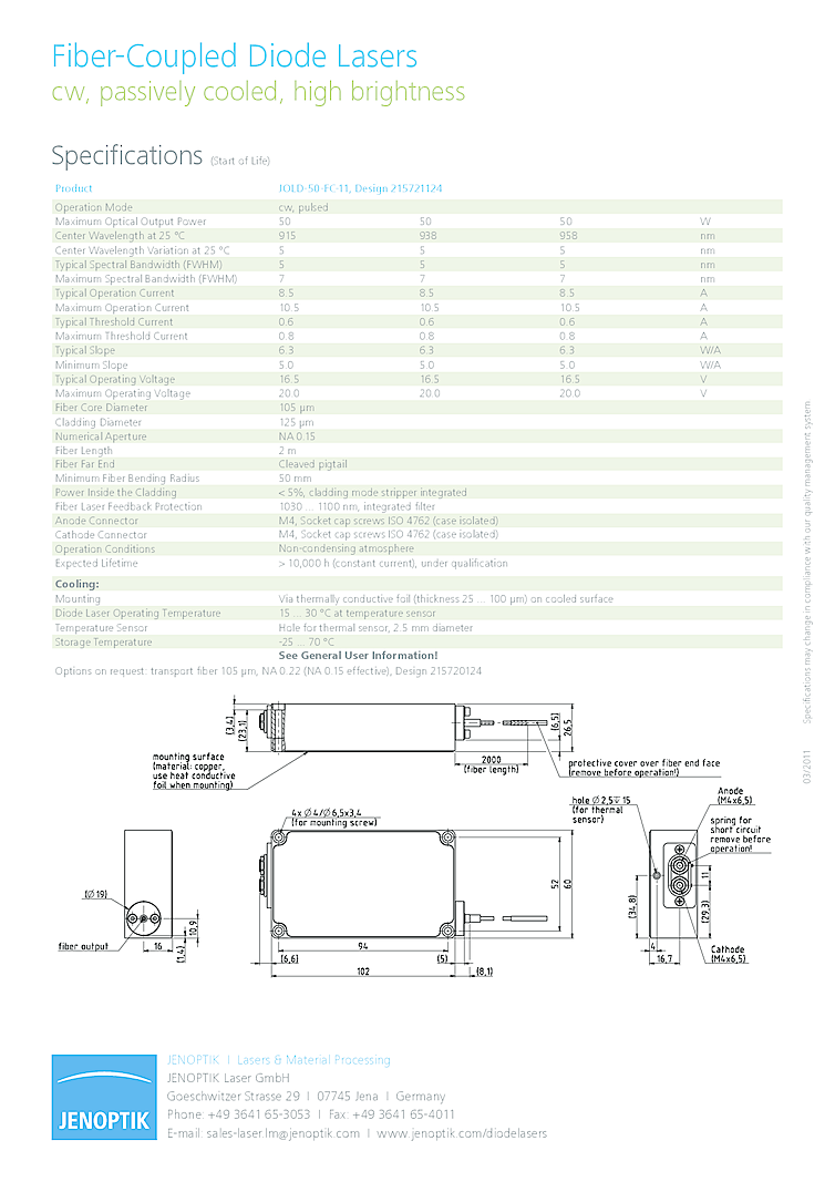 976nm Jenoptik Laser Diode is a fiber-coupled module which is specified as a CS, passively cooled and high brightness device. The data sheet attach details key features and benefits as follows. Typical operation current is specified at 8.5 Amps. These 976 nm lasers offer high optical output power at 50 Watts from a fiber core diameter of 105 micro-meters. The NA is specified at 0.15. These diode lasers are specified for cooling via mounting plate and offer a long lifetime of greater than 10,000 hours. Application are pumping of fiber lasers and material processing.