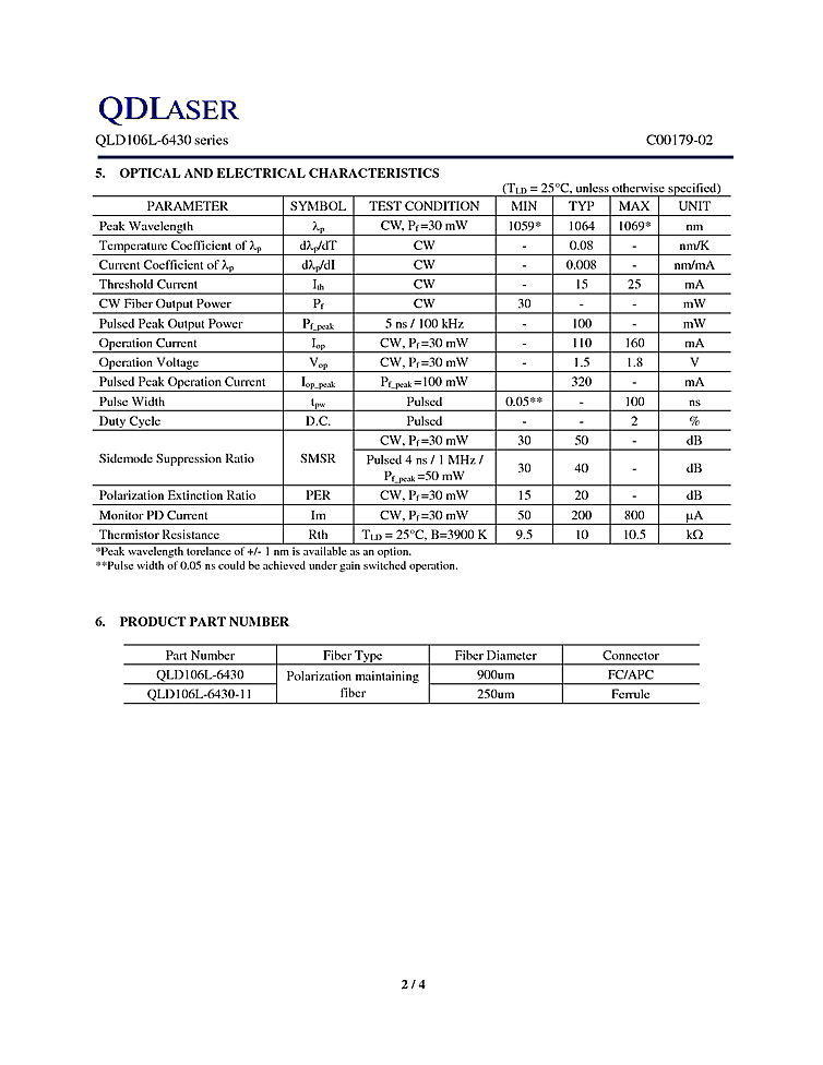 1064nm DFB laser diodes from QDLaser are offered in industry standard butterfly packages. The QLD106L-6430 is a distributed feedback (DFB) laser for use as a seeder for fiber lasers and sensing applications. The laser is offered with a monitor PD and an integrated thermoelectric cooler. Key features of these 1064nm diode lasers include single longitudinal mode operation, fiber-pigtailed 14-pin butterfly package without an optical isolator and with polarization maintaining fiber integration. These devices are specified for CW and Pulsed modes of operation.