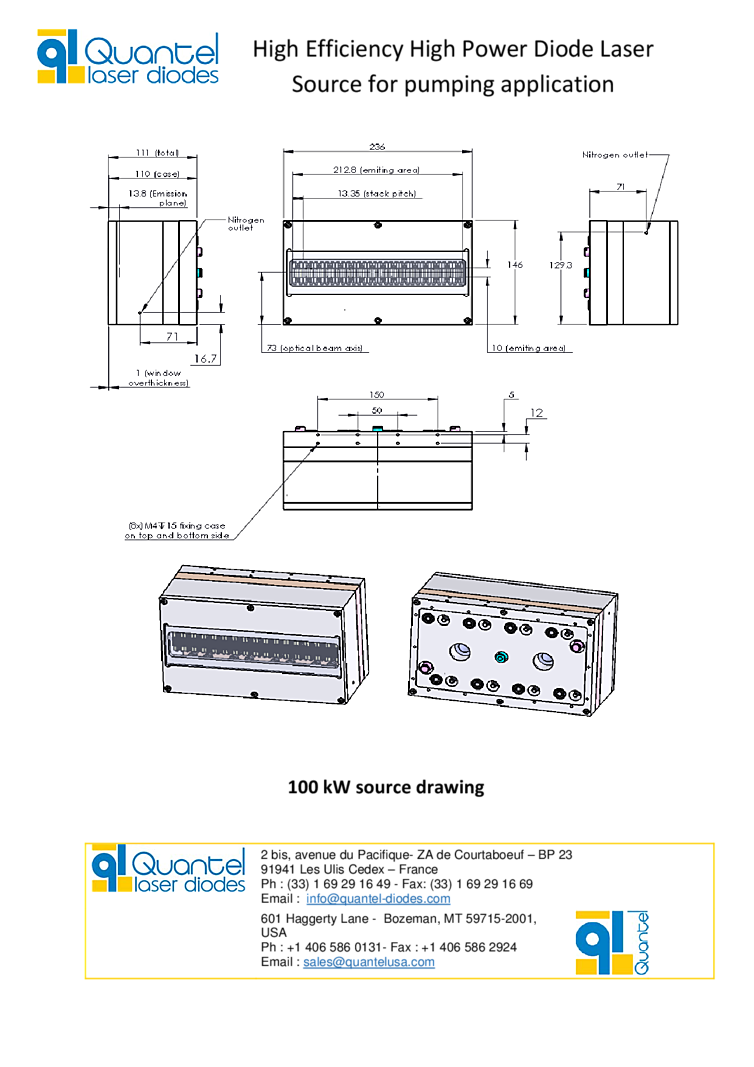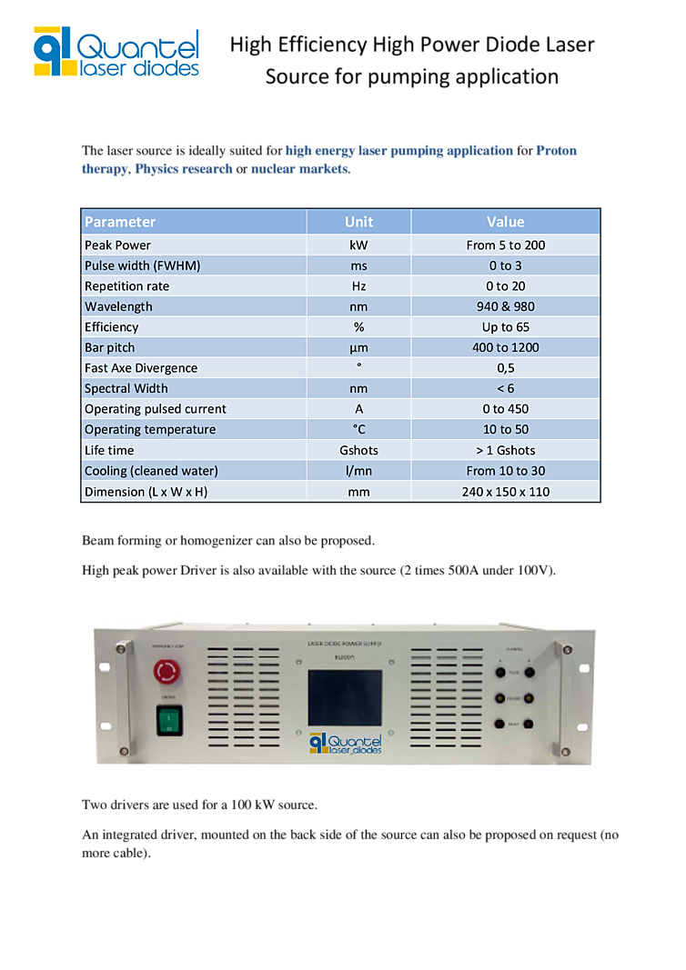 940nm High Efficiency High Power Diode Laser Source for pumping applications from Quantel Lasers. The source generates up to 100 kW power at 940 nm or 980 nm with a pulse width up to 3 ms. The components have been designed to highest possible efficiency which leads to a low power consumption, small spectral width and low heat generation. Diodes are collimated in the fast axis at a pitch of 800 μm (400 μm for 1ms pulse width). The source has 16 stacks, 10 to 20 bars each depending on the final power requested assembled with very low gap between each stack.