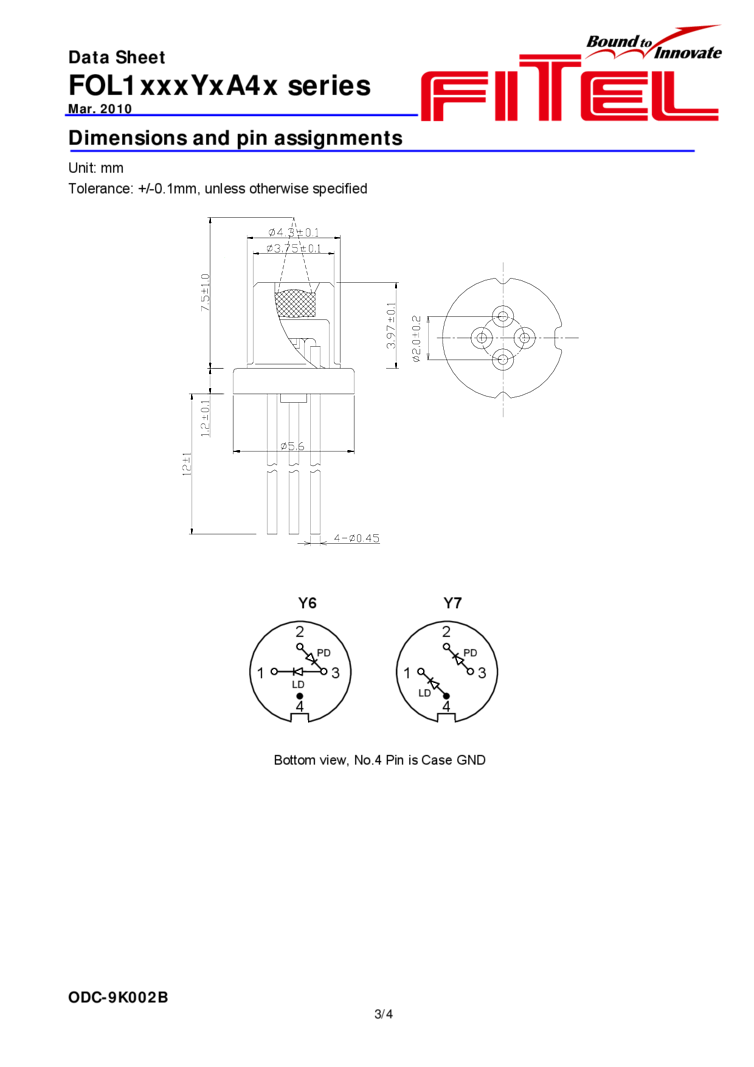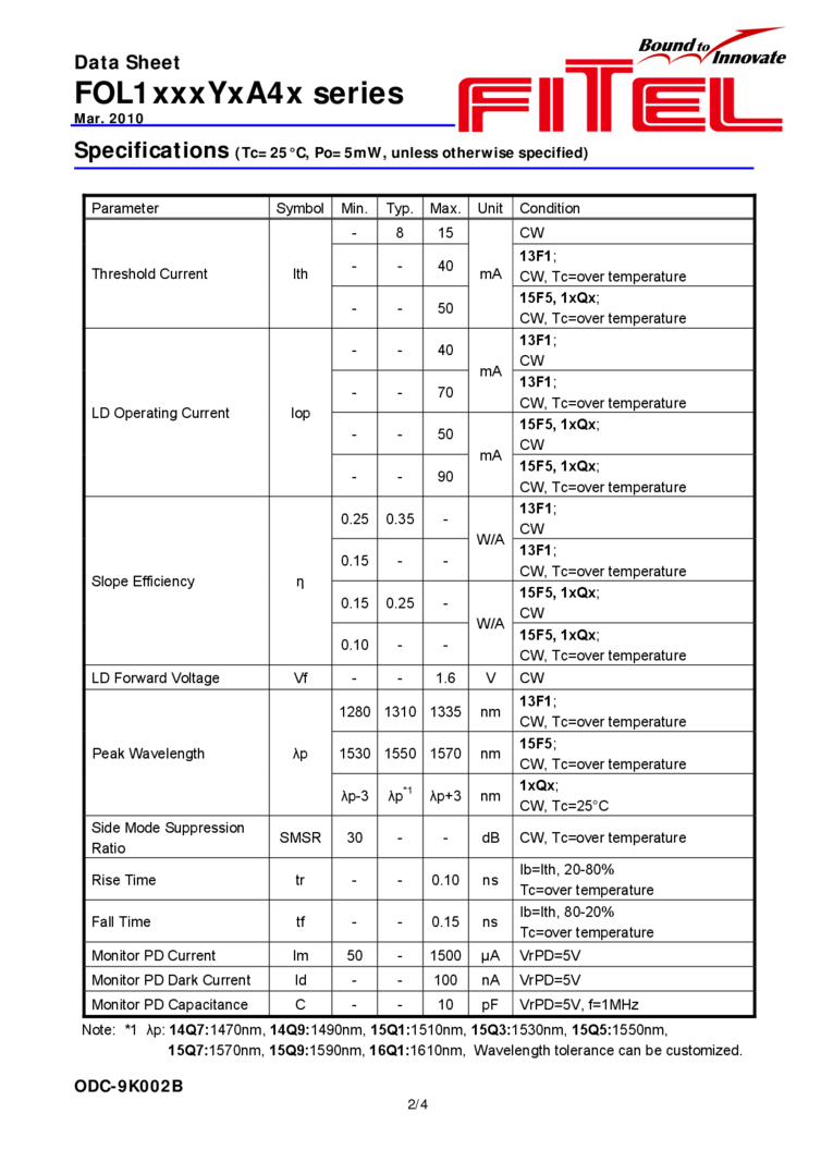 1310nm The DFB Laser from Fitel laser offers 1mW of output power in a TO-can package. Applications include digital transmission up to 2.5 GBPS and analog transmission. Includes optical power monitor for constant power operation. High suppression mode beam output and RoHS compliant. 1310 nm laser diode with output power up to 1 mW from Fitel.