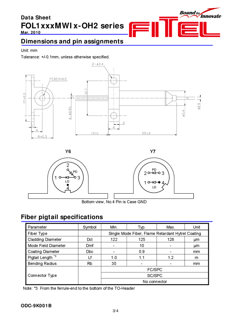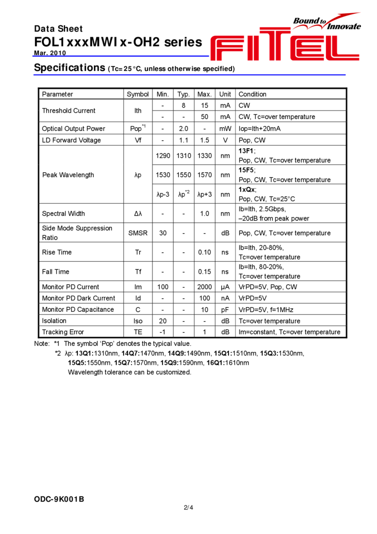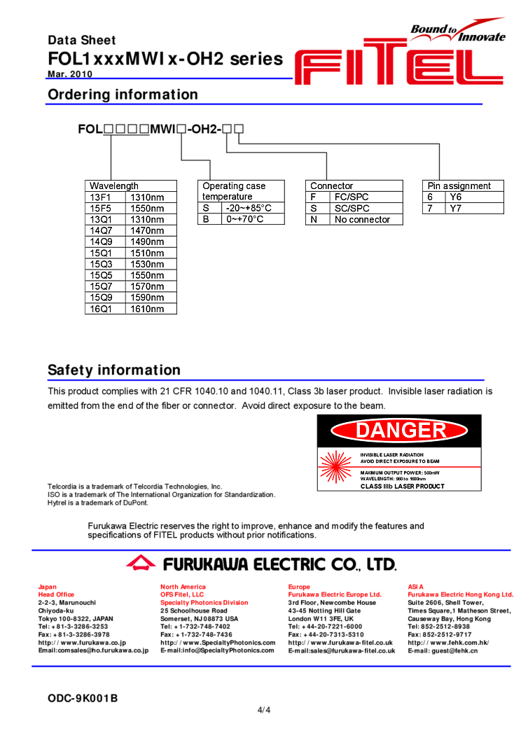 1310nm These FITEL laser series is a coaxial DFB laser module designed for digital transmission up to 2.5Gbps. The module is a coaxial package with a single mode fiber pigtail, which contains a DFB laser diode, a power monitor photodiode, and an optical isolator. This laser module complies with telecom requirements described in TelcordiaTM GR-468 and is manufactured in an ISOTM9001 certified production line.