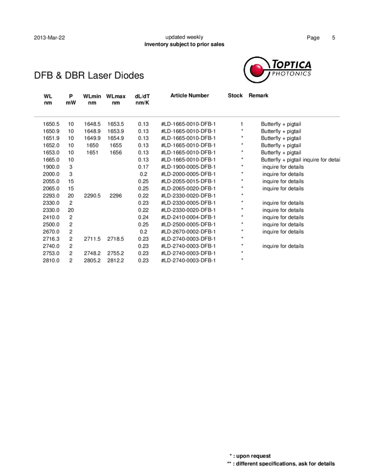 波長: 900nm-1190nm 出力: 140mW-140mW パッケージ: TO-can テクノロジー: DFB and DBR