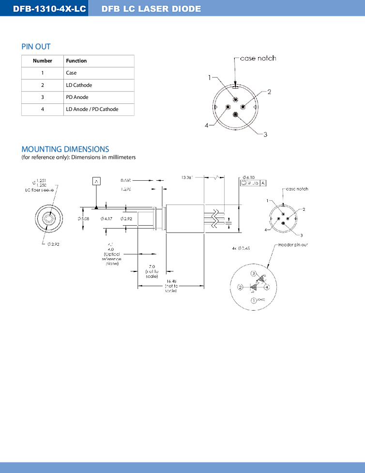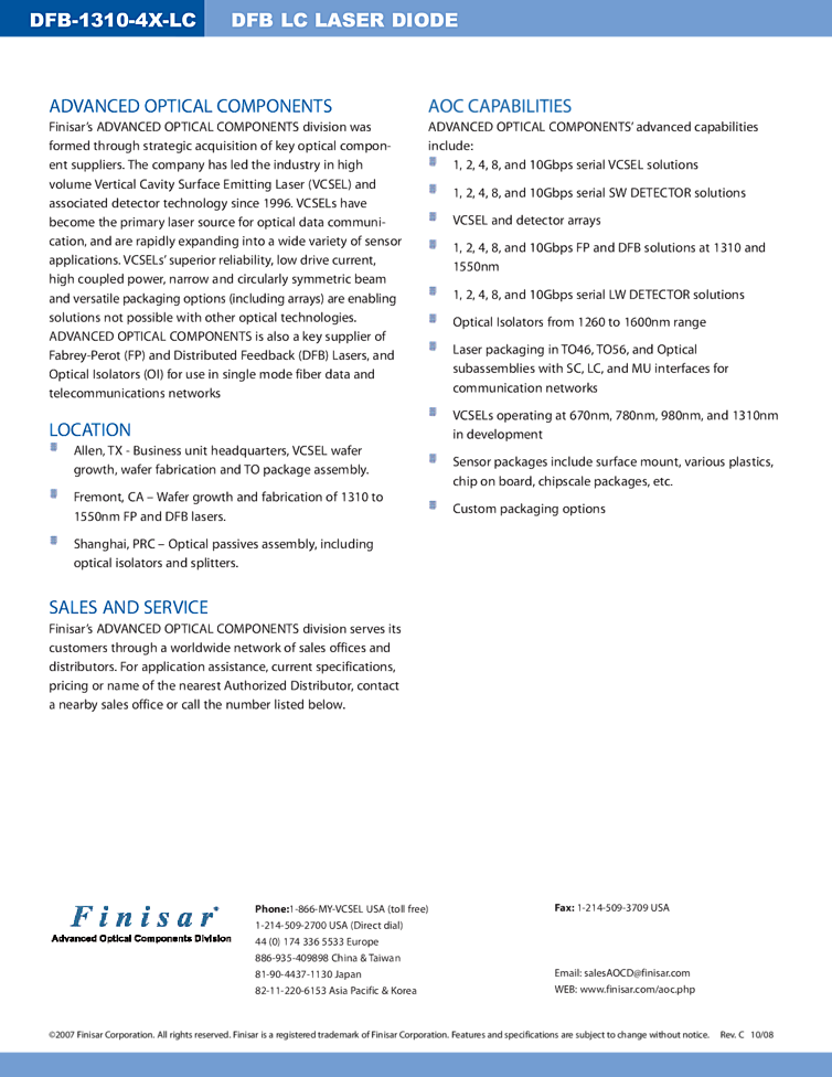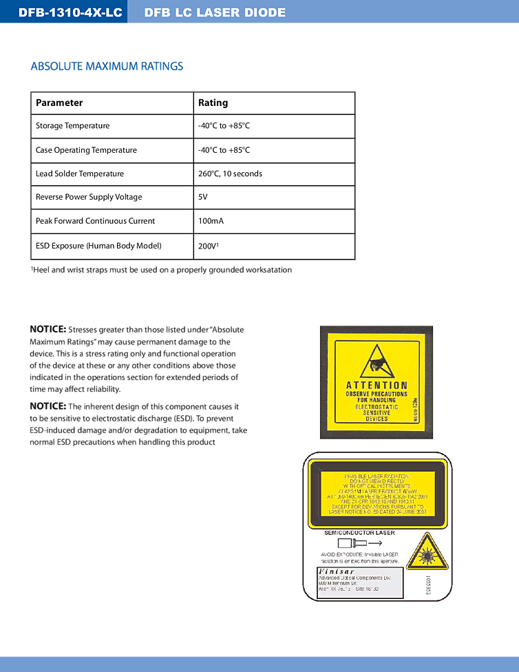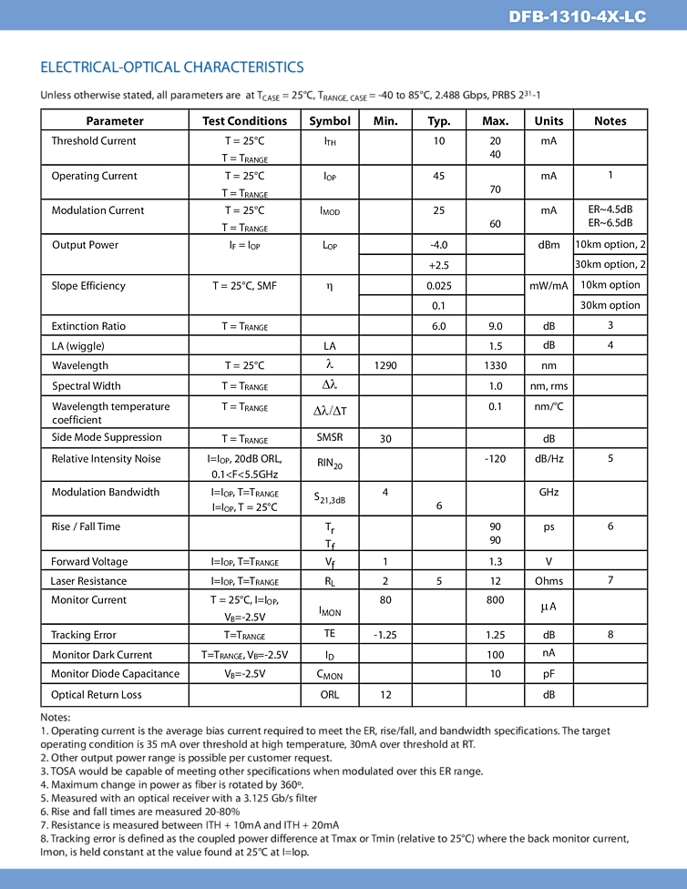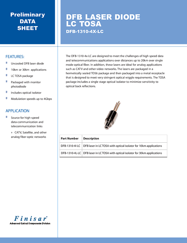 1310nm The Finisar DFB Lasers described in the attached product data sheet refer to the following: These 1310nm laser diodes are designed to meet the challenges of high speed data and telecommunications applications over distances up to 20km over single mode optical fiber. In addition, these lasers are ideal for analog applications such as CATV and other video networks. The lasers are packaged in a hermetically sealed TO56 package and then packaged into a metal receptacle that is designed to meet very stringent optical wiggle requirements. The TOSA package includes a single stage optical isolator to minimize sensitivity to optical back reflections.