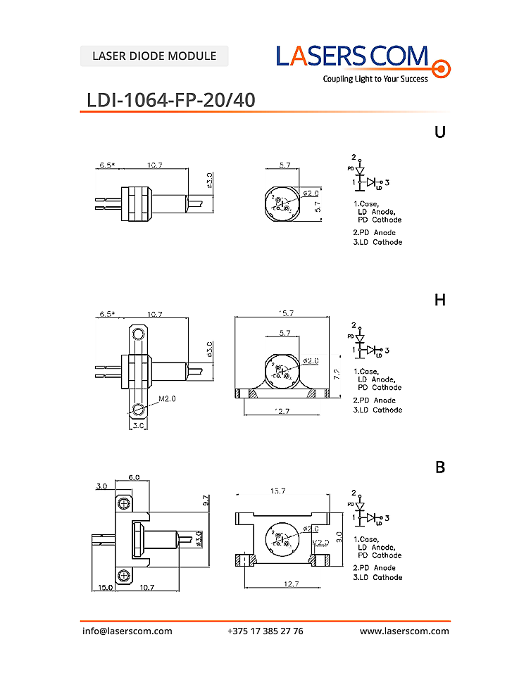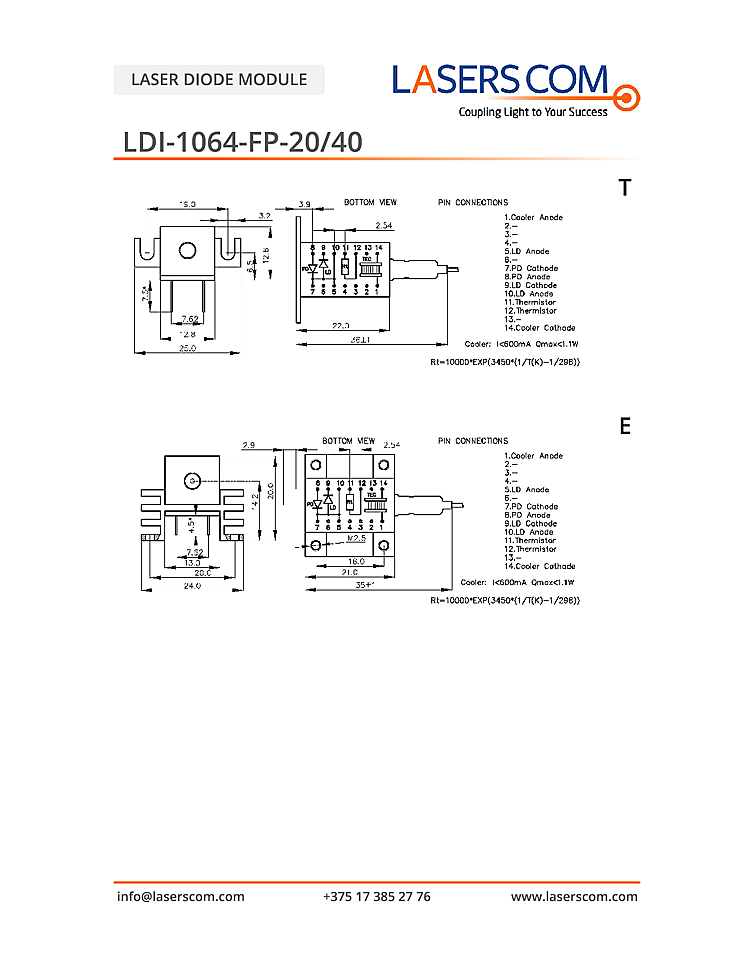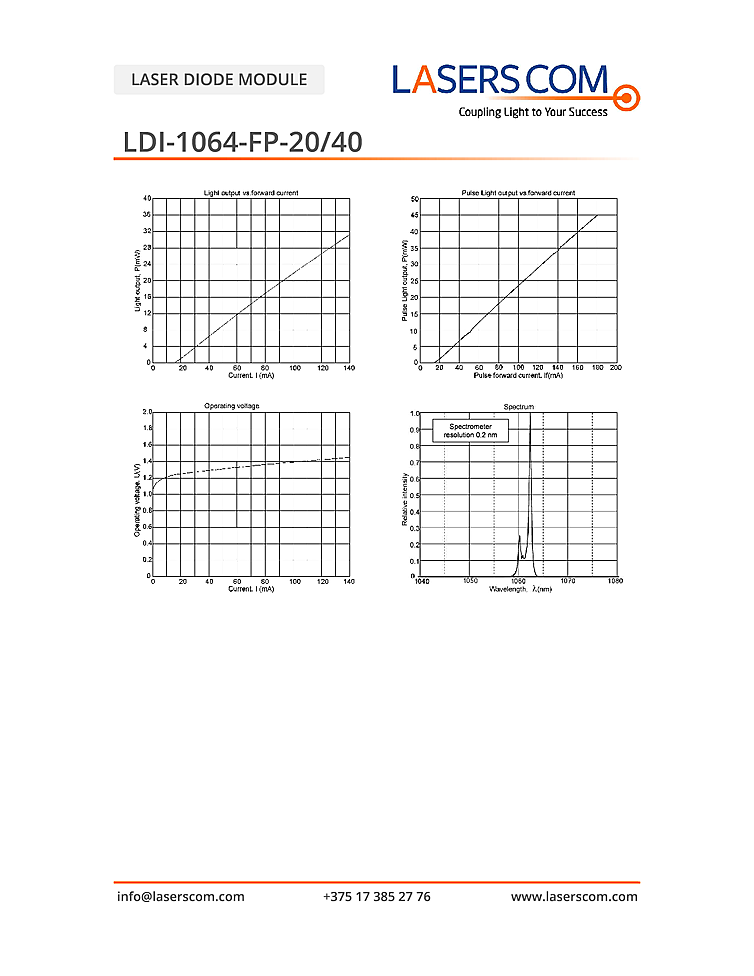 1064nm Laser diode module from LasersCom in a DIL or TO-can package. Fabry-perot laser output with pulse output power up to 40mW. TO-Can package includes integrated photodiode and small size makes it ideal for integration on to a PCB. DIL package includes an internal photodiode, TEC module and thermistor for stable optical power over a wide temperature range. Laser diode output is 1064nm with CW output power up to 20mW.