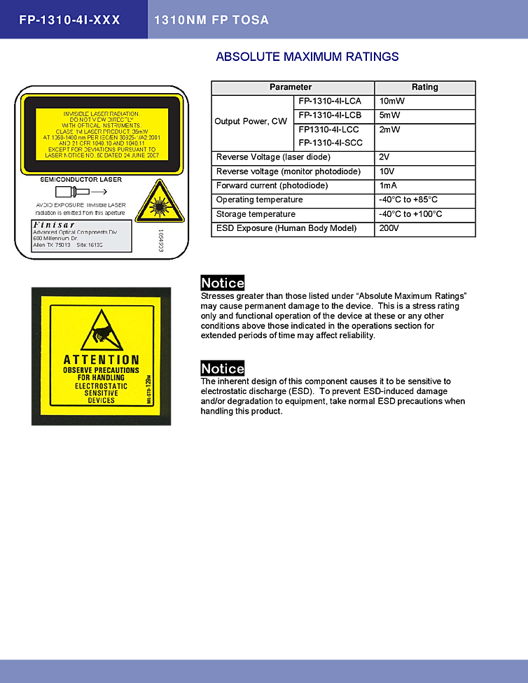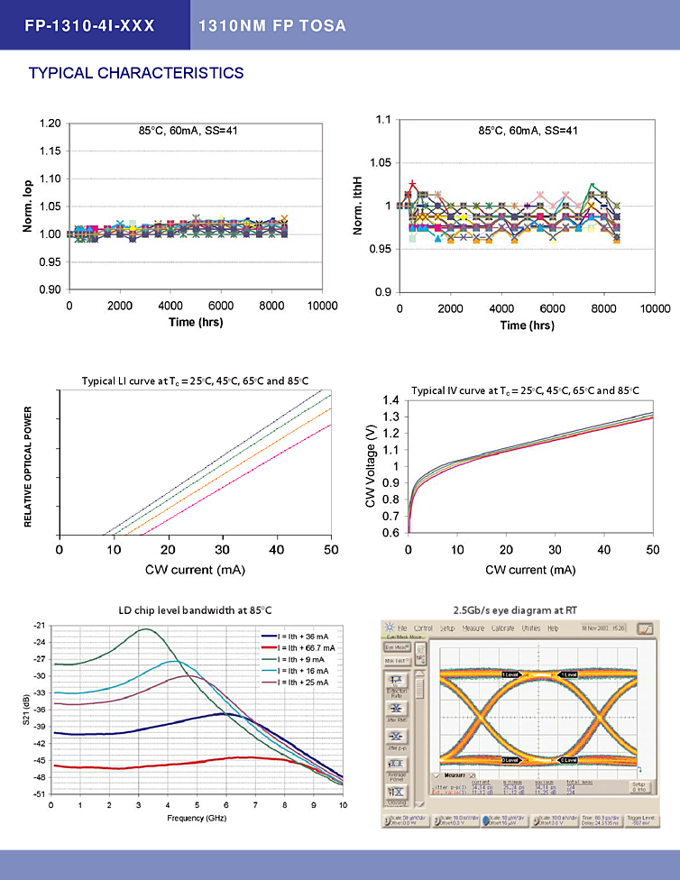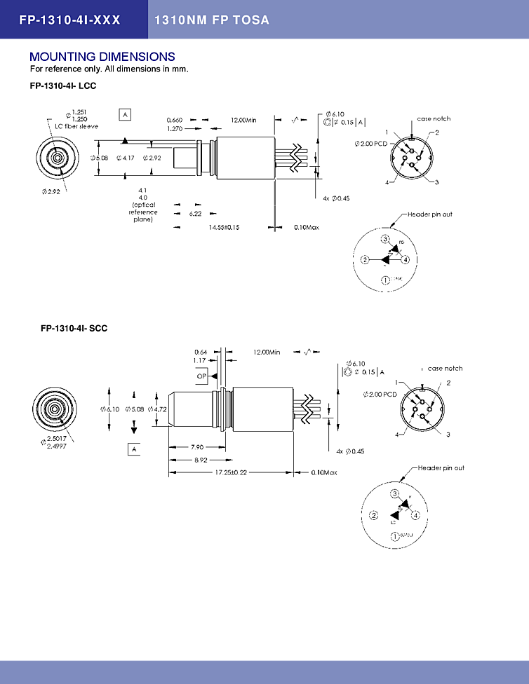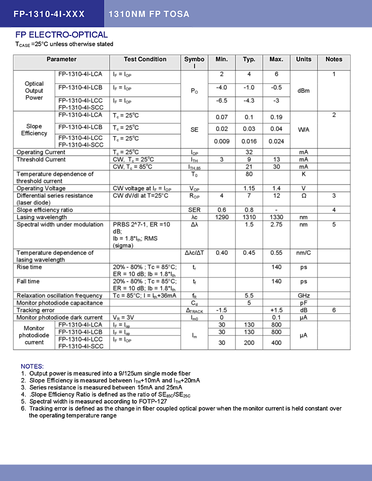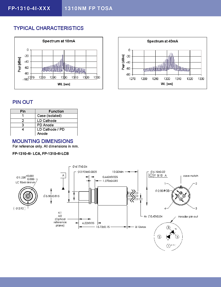 1310nm The FP-1310-4I is an MOCVD grown InAlGaAs ridge laser diode with emission wave-length of 1310 nm and standard continuous light output of 5mW per facet. These lasers provide stable, single transverse mode oscillation. These are hermetically sealed devices in a coaxial package (TO-56) with an integrated photodiode to monitor the optical output. Suitable as a light source in data-com and telecom applications with data rates up to 4 Gb/s. Available in three output power options and a choice of LC and SC metal TOSA package.
