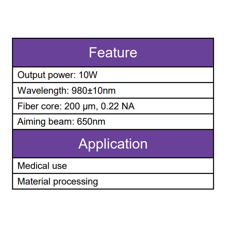 These 980nm devices are suitable for medical use, material processing, laser pumping and other pumping applications.