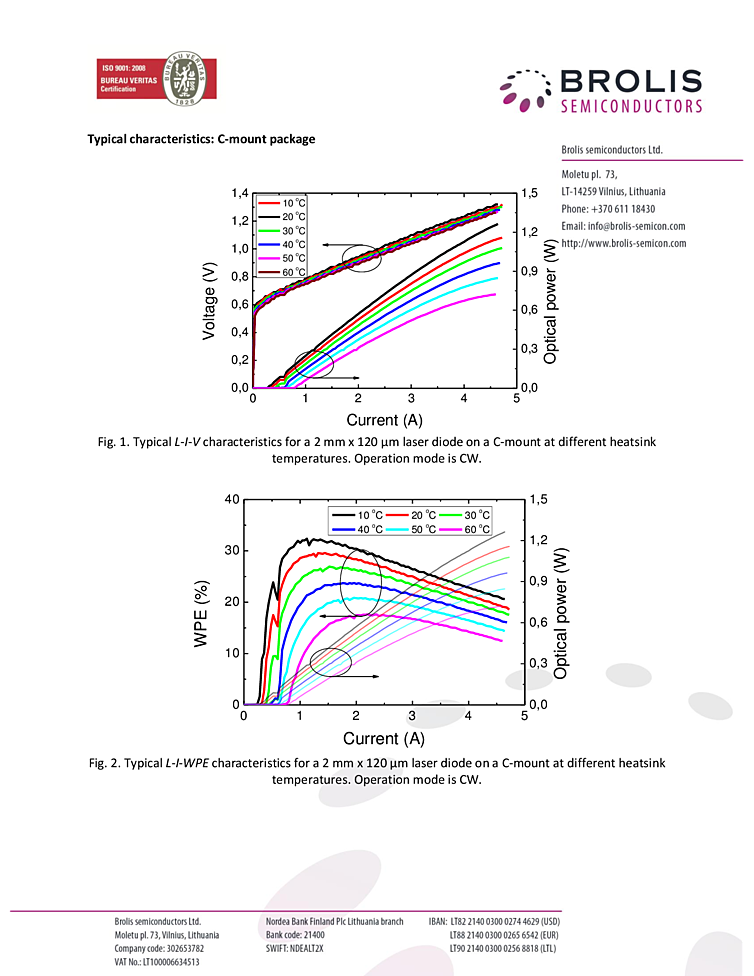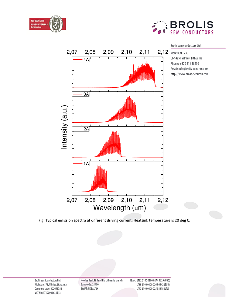 2110nm Laser Diode from Brolis is a 1.2W laser mounted on a c-mount package. Threshold current is specified at 340 mA with an operating current of 4 Amps. This 2110nm laser specifies an operating voltage of 1.2V and is a fabry-perot device.