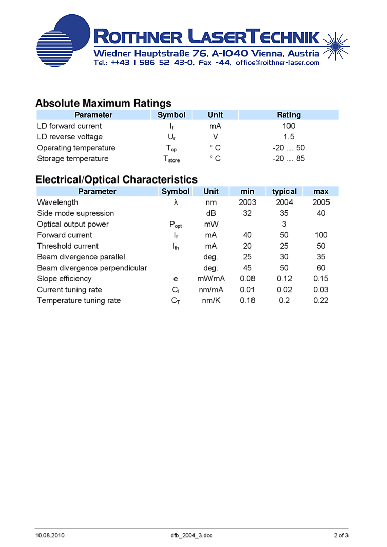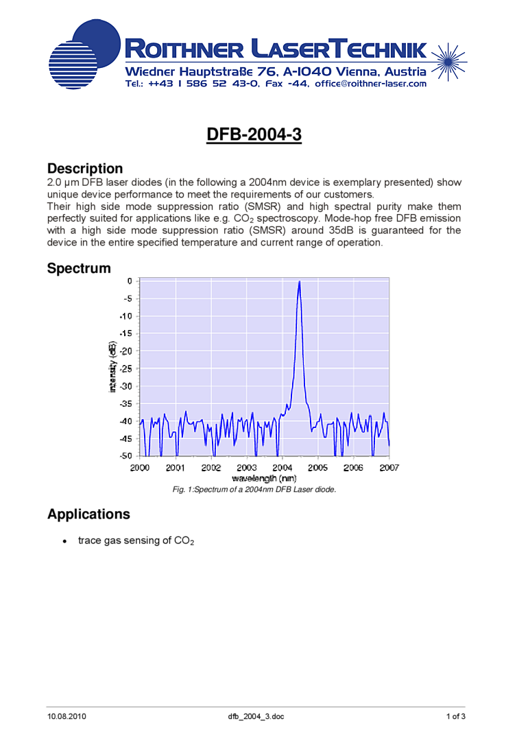 2000nm 2.0 micron DFB laser diodes (in the following a 2004 nm device is exemplary presented) show unique device performance to meet the requirements of our customers. High side mode suppression ratio (SMSR) and high spectral purity make them perfectly suited for applications like e.g. CO2 spectroscopy. Mode-hop free DFB emission with a high side mode suppression ratio (SMSR) around 35 dB is guaranteed for the device in the entire specified temperature and current range of operation.