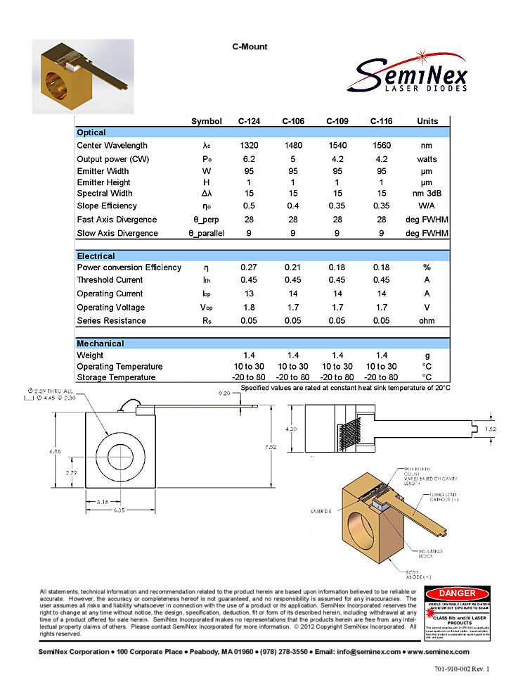 1540nm Applications for the attached Seminex 5watt laser diode include medical laser equipment, LIDAR, free space communication, DPSSL pumps and Military / Aerospace apps. The attached data sheet provides LIV information for multiple temperature setpoints.