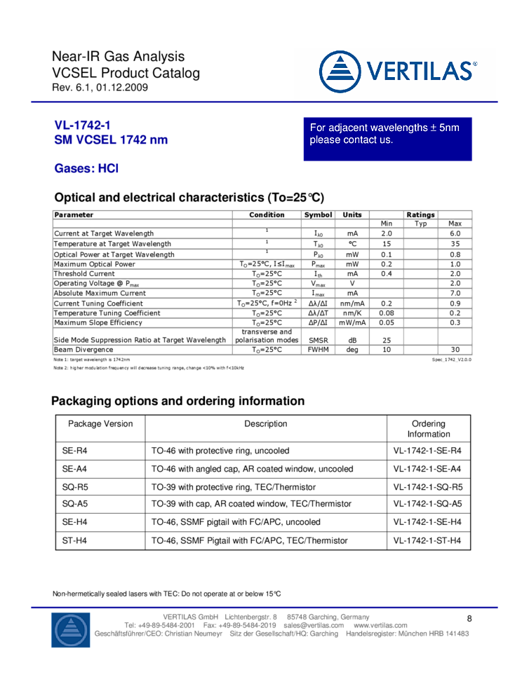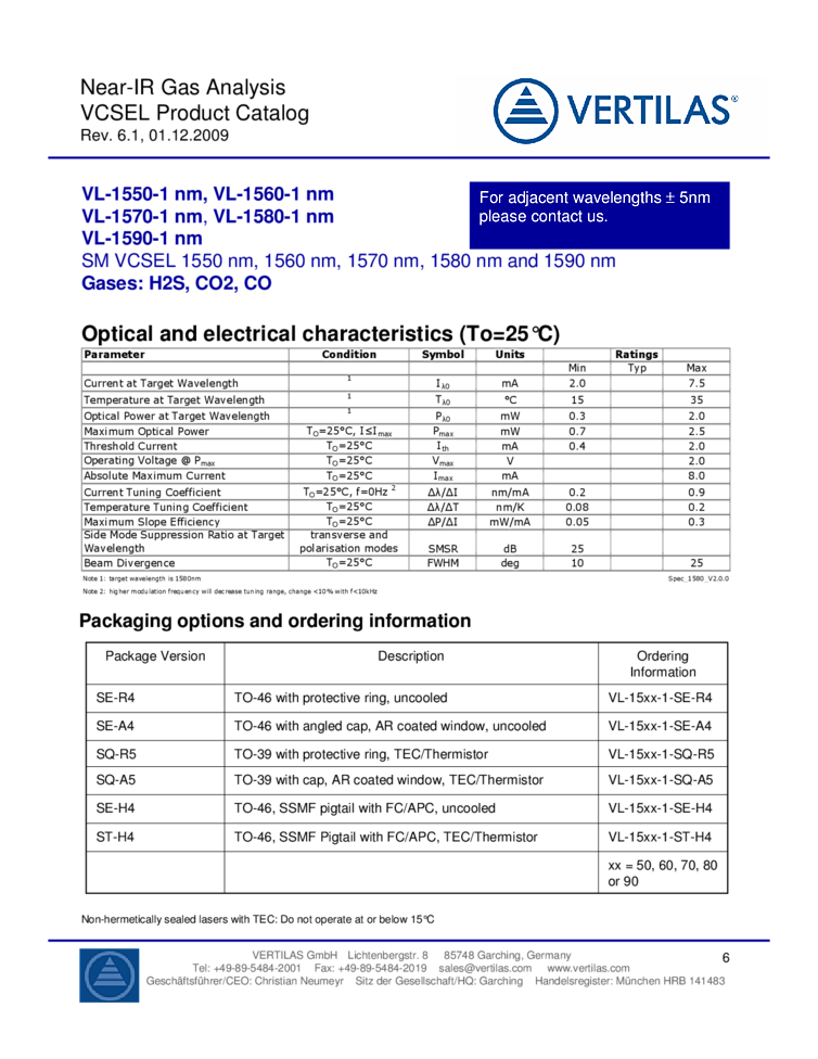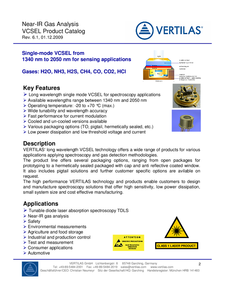 1510nm to 2050nm The VERTILAS long wavelength VCSEL devices described in the attached data sheet offers 2mW optical output power in a TO-can package Key applications for these devices include spectroscopy and gas detection methodologies. The product line offers several packaging options, ranging from open packages for prototyping to a hermetically sealed packaged with cap and anti reflective coated window. It also includes pigtail solutions and further customer specific options are avilable on request. The high performance VERTILAS technology and products enable customers to design and manufacture spectroscopy solutions that offer high sensitivity, low power dissipation,