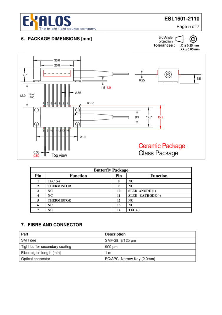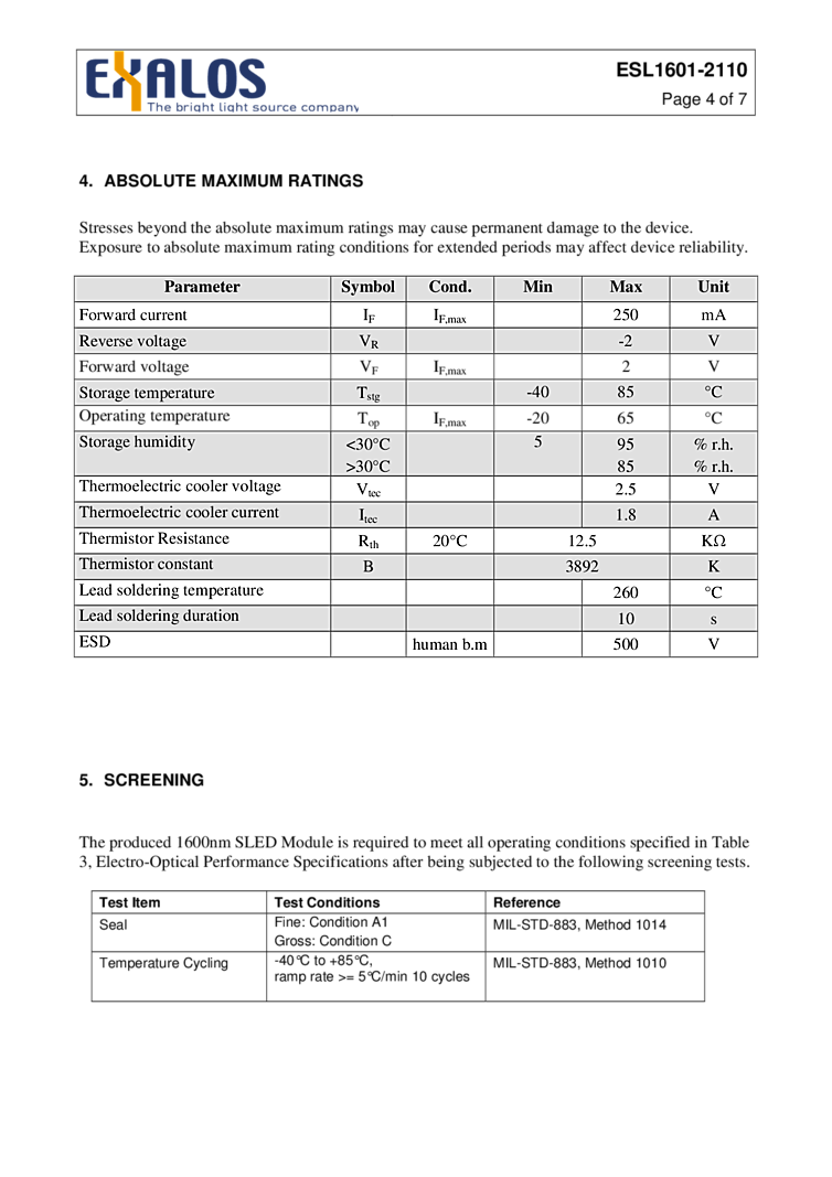 1600nm The EXALOS Laser (SLED) is a superluminescent light emitting diode with a 1 mW optical output power packaged in a standard 14 pin butterfly package with integrated cooler and temperature sensor. This 1600nm SLED lists a 250mA drive current maximum. For details, refer to the data sheet attached.