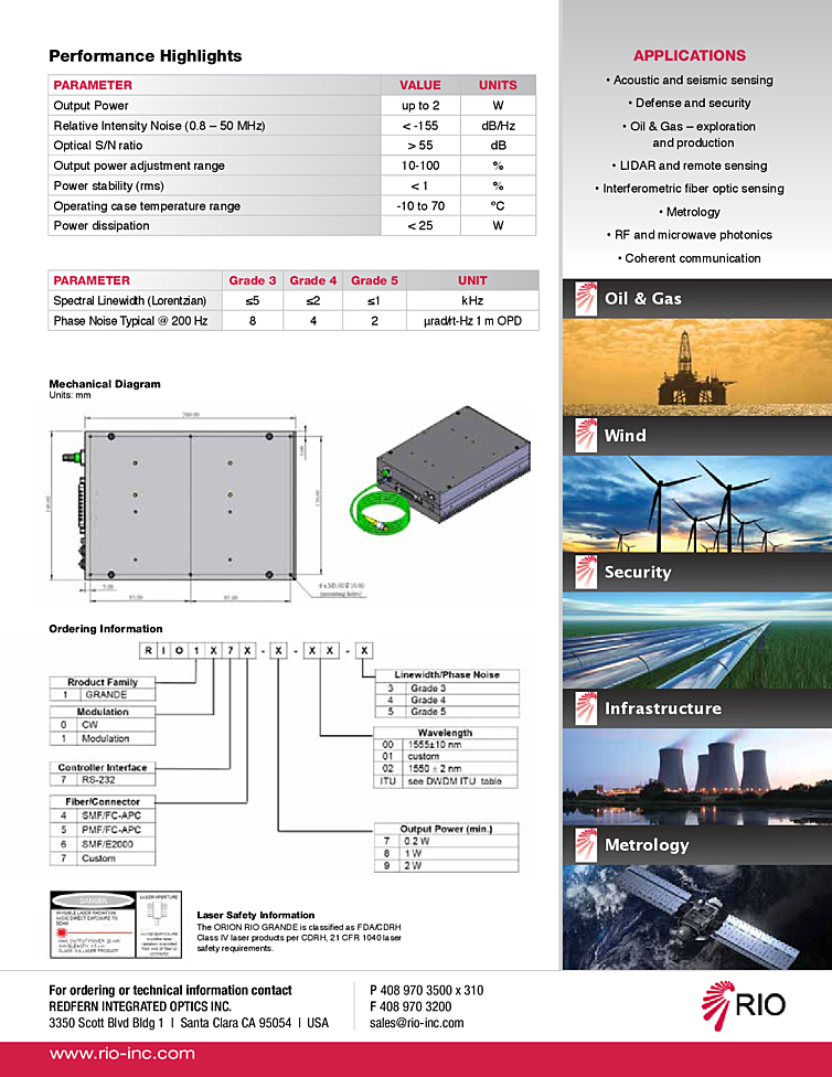1545nm-1565nm RIO GRANDE High Power Narrow Linewidth & Low Phase Noise Laser Module. The RIO Grande high power laser module builds upon the proven performance of RIO’s game-changing ORION™ product series. In addition to the ORION’s unrivaled reliability and robustness, along with the integration of a high performance and low noise EDFA, the RIO Grande laser modules provide superior value with up to 2W output power, very low RIN, ultra low phase noise and narrow linewidth, exceptional wavelength stability and insensitivity to vibration.