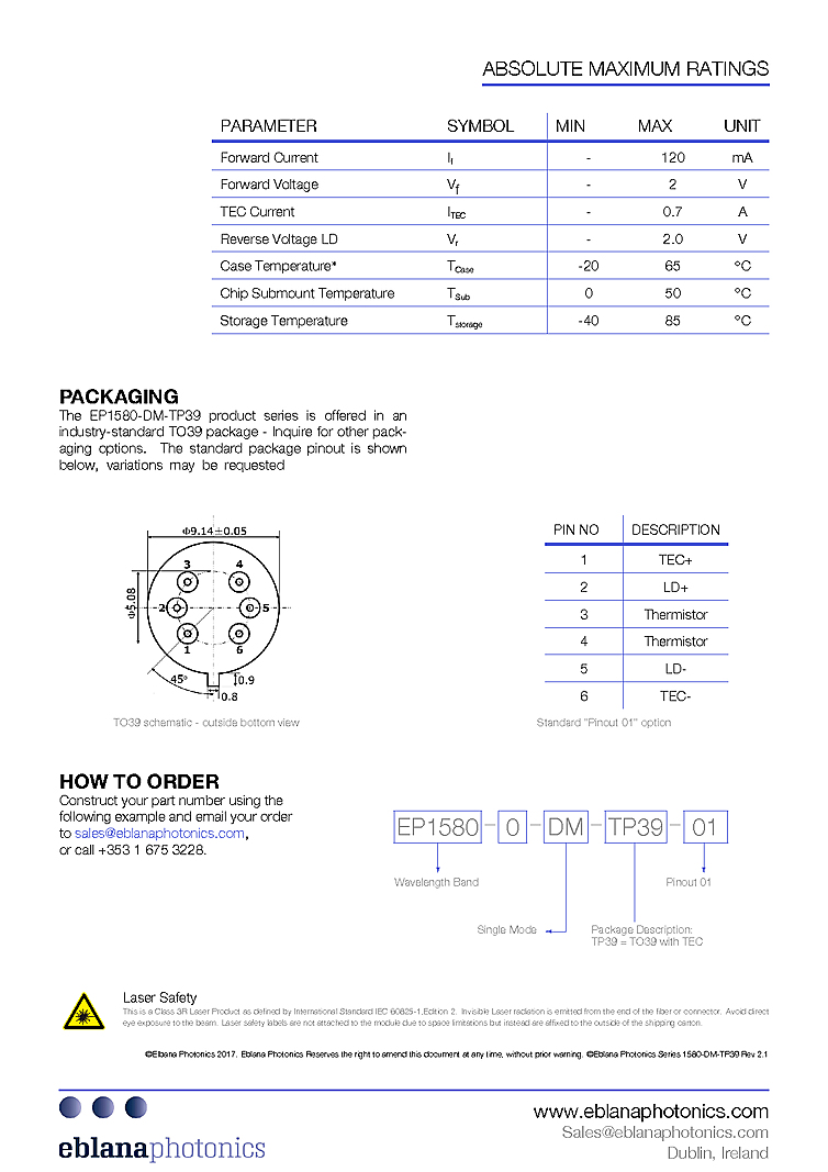 Eblana Photonics EP1580-DM-TP39 laser, available in the 1560-1595nm range, is designed to coincide with H2S,