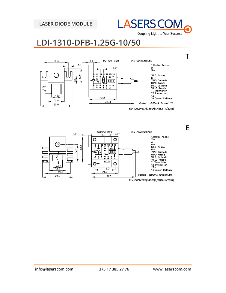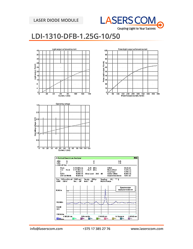 1310nm Laser diode from LasersCom designed for applications in optical data systems with modulation up to 2.5Gbps. Standard laser packages include DIL or TO-can. An integrated photodiode is standard in the TO-can package for automatic power control. The DIL package provides a photodiode, TEC module and thermistor for long term optical power stability. DFB laser diode with wavelength of 1310nm and output power up to 10mW.