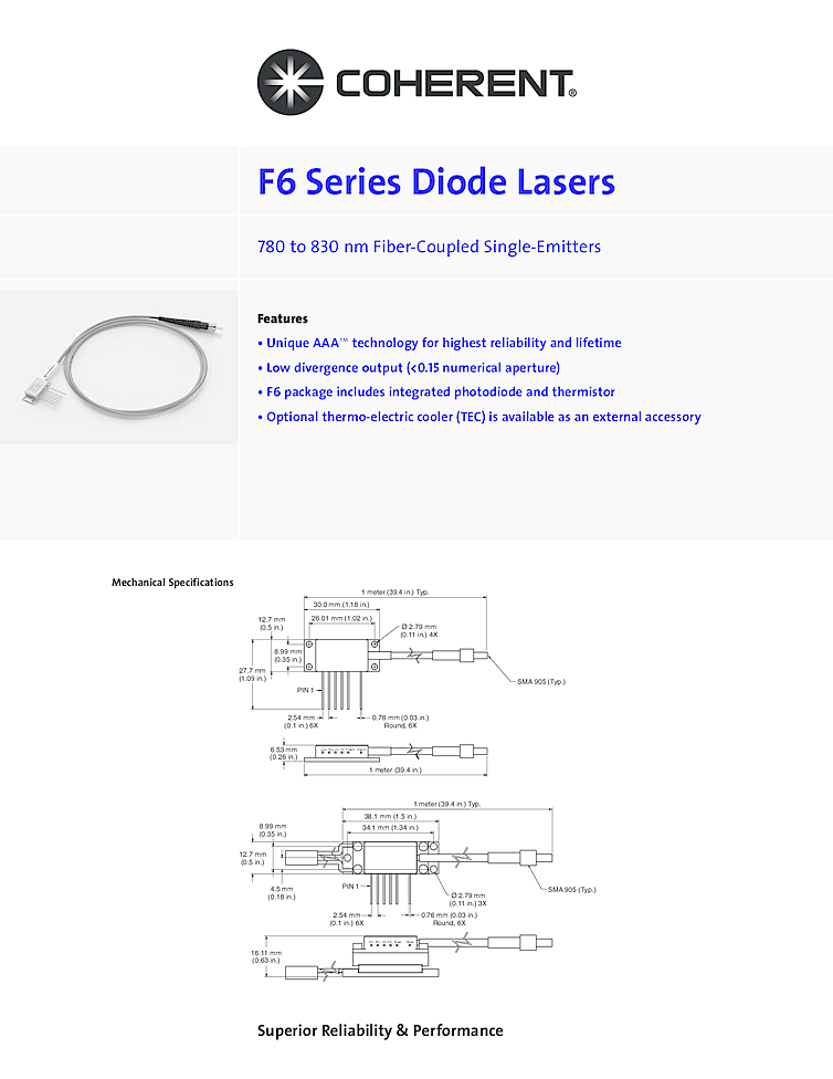 波長: 790nm-808nm 出力: 2400mW-2400mW パッケージ: F6, fiber coupled array テクノロジー: high powered laser array
