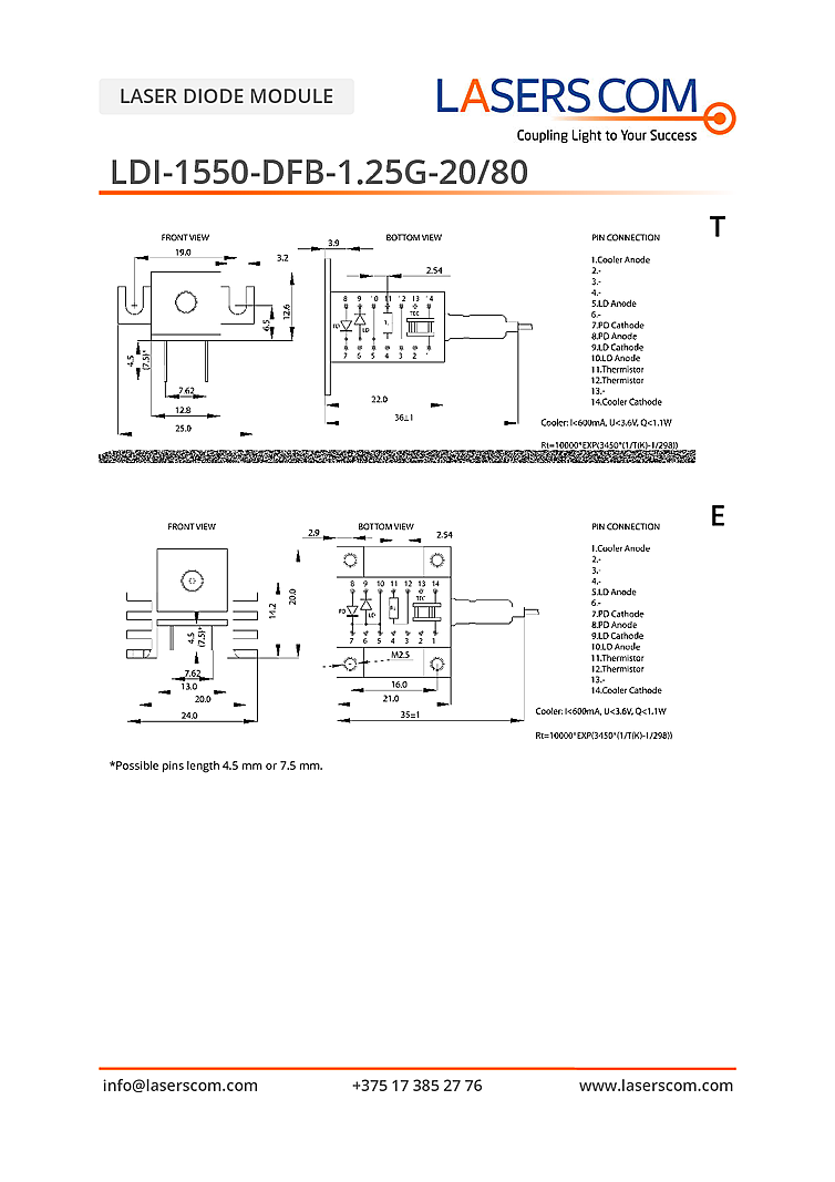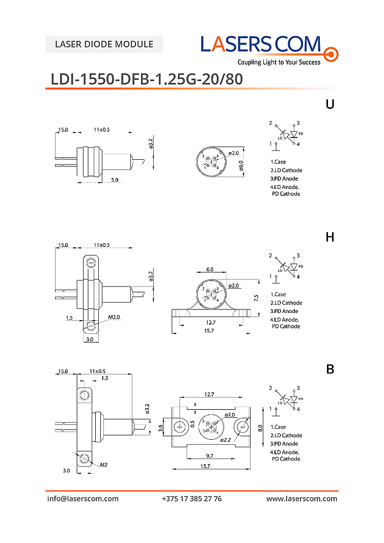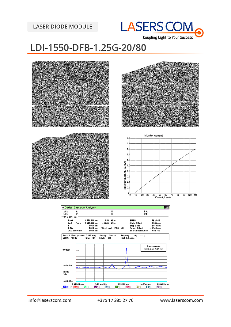 1550nm DFB laser diode from LasersCom designed for application in optical fiber communication systems with data rate up to 1.25 Gbps. Laser diode is available in fiber coupled TO-can and DIL package. Inquire about complete laser control system. Spectral width is less the 0.5 MHz. Continuous wave operation up to 20mW with pulsed operation up to 80mW. Integrated back facet monitor for constant optical power operation and DIL package includes TEC for stable wavelength operation over the temperature range. DFB laser diode output wavelength is 1550nm.