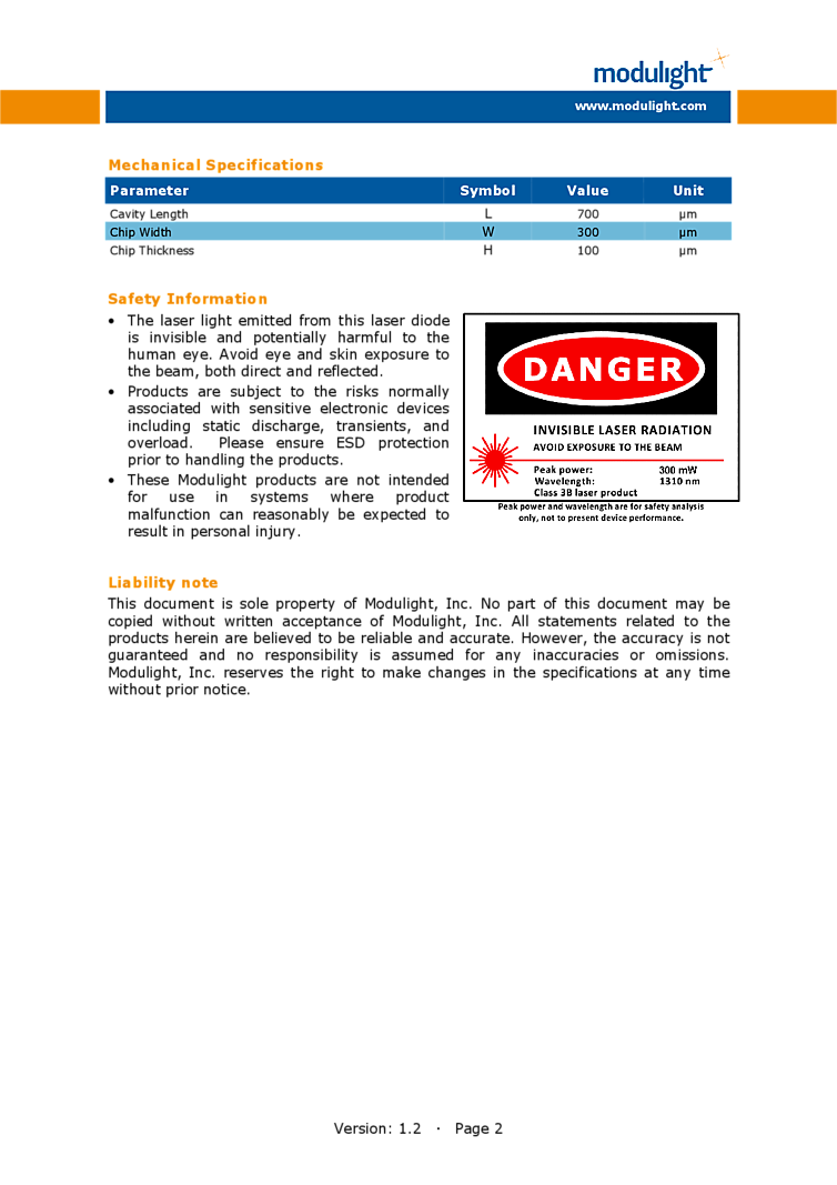 1310nm Modulight’s ML1003 is a high-performance single transverse mode Fabry-Perot laser chip product. The laser emits 300 mW pulsed peak power (10 µs PW, 1%DC) at 1310nm wavelength. This bare die laser chip is designed to be used as light source in fiber optic test and measurement equipment.