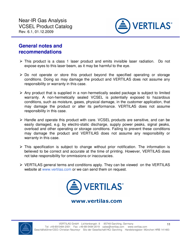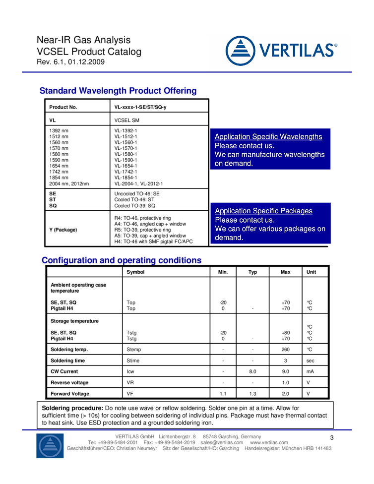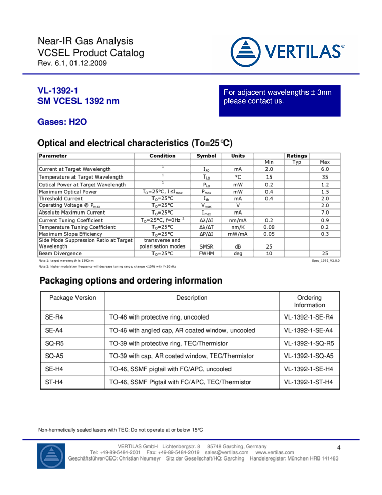 1340nm-2050nm VCSEL lasers from VERTILAS offer the following descriptions details in the attached data sheet. Long wavelength VCSEL technology offers a wide range of products for various applications applying spectroscopy and gas detection methodologies. Applications include tunable diode laser absorption spectroscopy TDLS, near-IR gas analysis, safety and environmental measurements. Also referenced are agriculture and food storage as well as industrial and production control, and test and measurement applications. Consumer and automotive app's are also included. The product line offers several packaging options, ranging from open packages for prototyping to a hermetically sealed packaged with cap and anti reflective coated window. It also includes pigtail solutions and further customer specific options are avilable on request. The high performance VERTILAS technology and products enable customers to design and manufacture spectroscopy solutions that offer high sensitivity, low power dissipation, small system size and cost effective manufacturing.