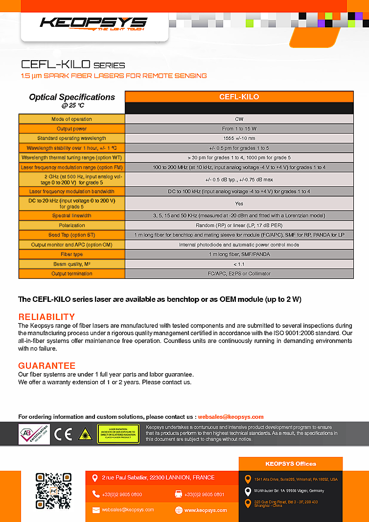 Continuous-wave narrow linewidth fiber laser from Keopsys: The data sheet below references the following key features. This fiber laser was designed to achieve single longitudinal mode with ultra low phase noise and RIN. Optional features of the CW laser inlcude wavelength tunability and laser frequency modulation. The Erbium fiber Laser line width can be as low as 3 kHz as measured at -20 dBm and fitted with a Lorentzian model. These KEOPSYS lasers are designed to provide for maintenance free operation over a long life time and are ideal for OEM or laboratory scientific applications. These narrow line width lasers output at 1550nm wavelength with an output power up to 15 watts.