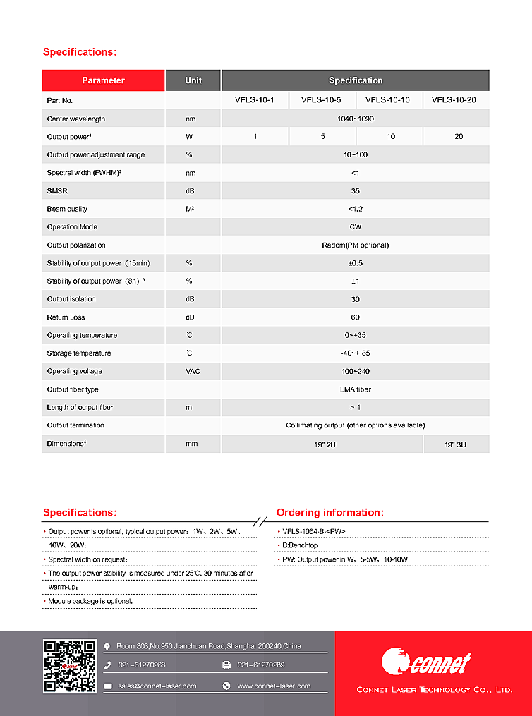 Continuous wave fiber laser system from Connect Laser for applications in spectroscopy, scientific research, and test and measurement. Single mode PM fiber output with collimated output and other connectors available upon request. Adjustable output power from 10 to 100% of maximum output. Four models available with output from 1 watt to 20 watts and 50 watt available upon request. Benchtop chassis with front panel control and remote control. OEM systems available upon request. CW fiber laser wavelength is 1064nm.