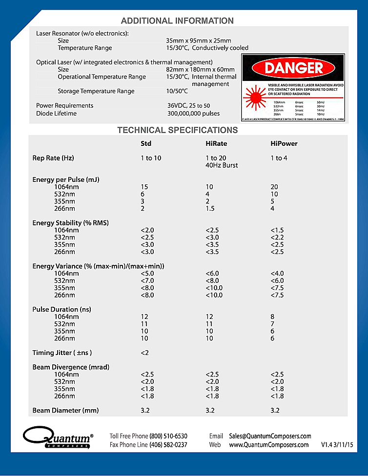 Nd:YAG Laser with nanosecond pulse output from Quantum Composers. The compact monolithic resonator design is ideal for integration into scientific and industrial applications. Remote control is possible from USB interface or optional Bluetooth connection. Careful selection of reliable pump diodes provides a long lifetime. Nd:YAG laser wavelength output is 1064nm with output energies up to 5mJ.