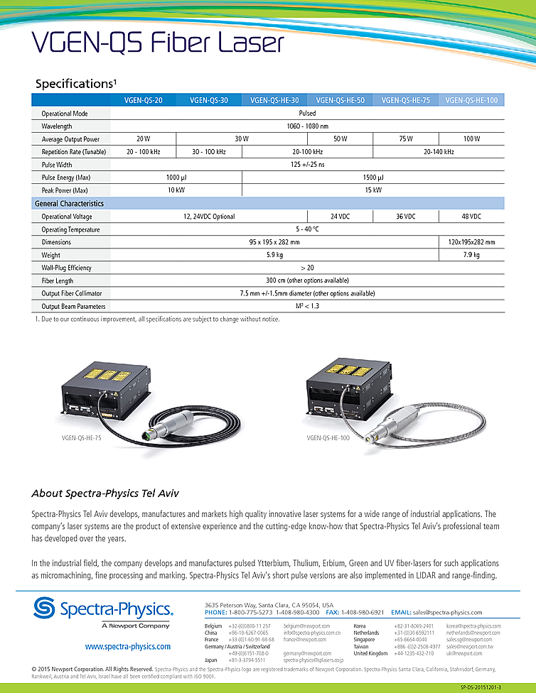 Fiber laser with nanosecond pulse output from Spectra-Physics. Laser features excellent beam quality M2<1.3 with a fiber collimator 7.5mm. Laser can be controlled by industry standard RS-232 or TTL. Fiber laser efficient design uses forced air, water cooling not required. Optional output collimators for variety of output beam diameters. Peak power is available up to 15 kWatts with average output power of 100 watts. Tunable pulse frequency from 20 to 140kHz with a pulse duration of 125 nanoseconds. Fiber laser wavelength is 1060nm with pulse energy up to 1.5mJ.