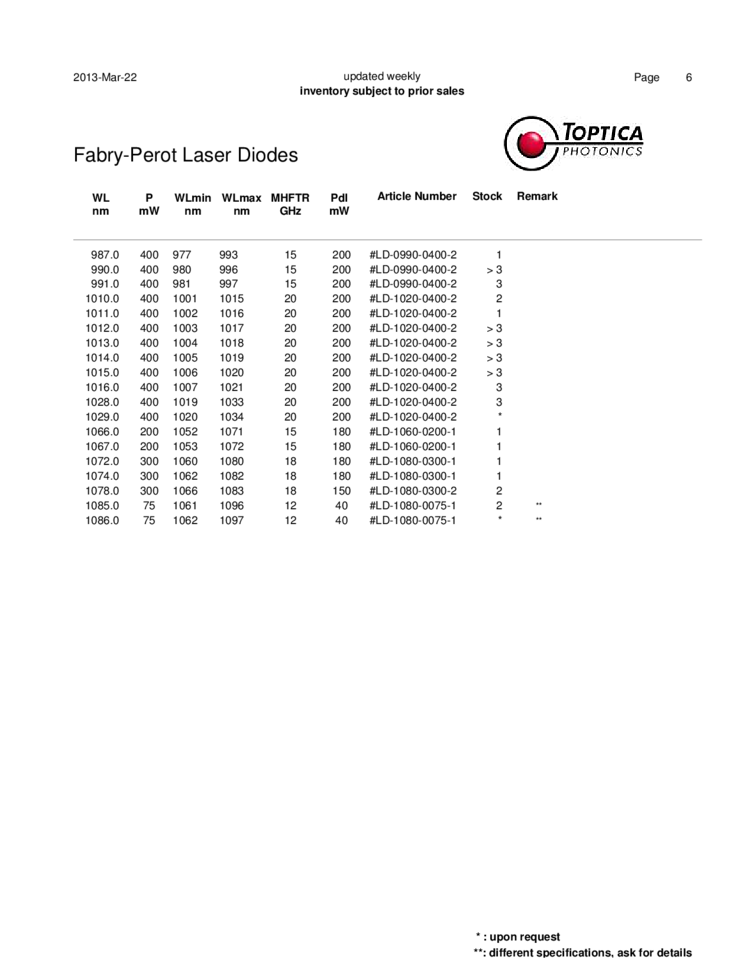 636nm-1086nm Fabry-Perot Laser Diodes from Toptica. The wavelength is measured under standard working conditions (25°C, maximum power). It can shift to a shorter wavelength at lower temperature and less current. The wavelength of diodes marked "not selected" is specified to the precision of the manufacturing process (typically +-5nm) and is not measured for the individual diode. WL and P indicate the wavelength and power of the free running diode. WLmin , WLmax, MHFTR, Pdl specify the performance achieved in our external cavity diode laser product DL 100 for shortest wavelength, longest wavelength, mode-hop free tuning range and output power, respectively. All diodes operate in single transverse mode. They are shipped in industrial standard packages (5.6 mm or 9 mm can) unless mentioned otherwise.