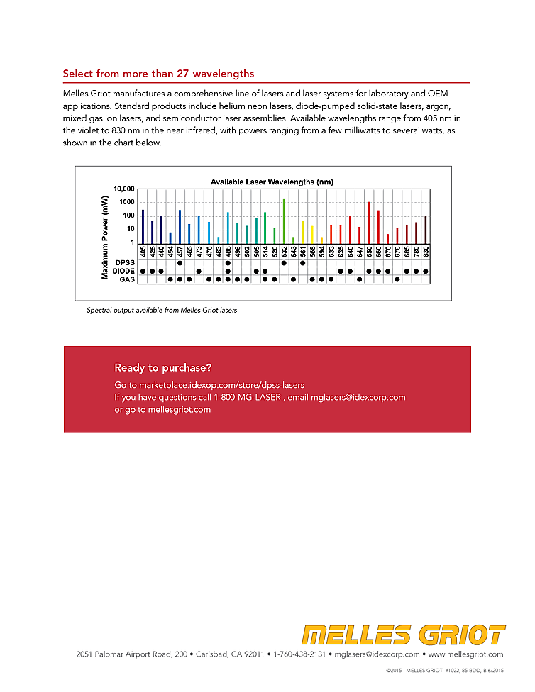 Melles Griot compact diode pumped solid state laser features high stability, excellent beam quality M2<1.2, and long life times. Designed for a wide variety of uses in the laboratory and the low power consumption makes it ideal for integration into laser systems. DPSS laser has optional modulation. CW Laser output power up to 50 mW at a wavelength of 488nm.