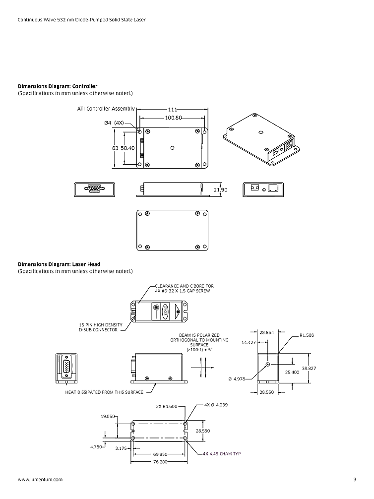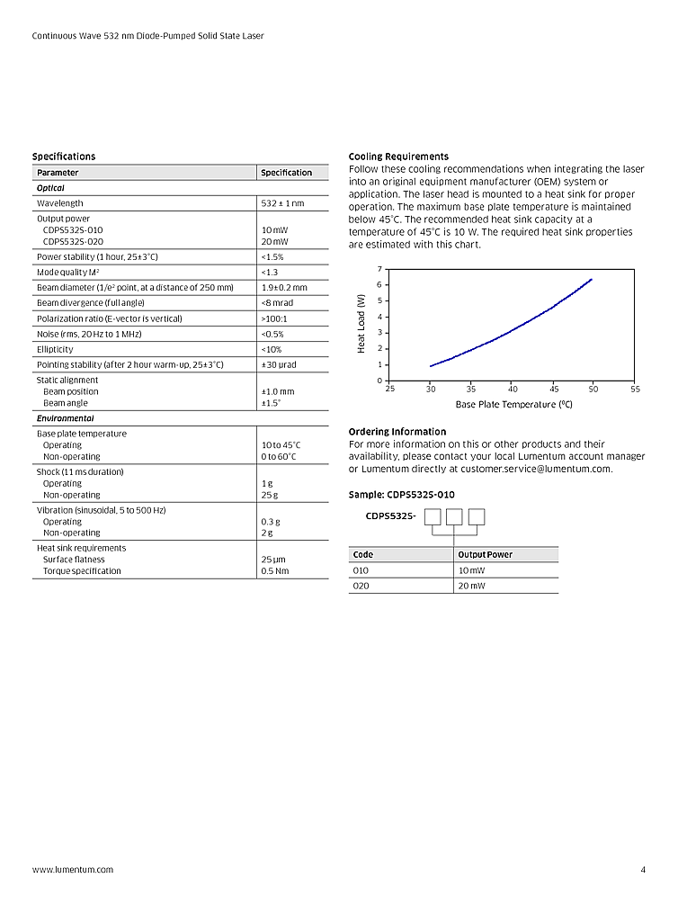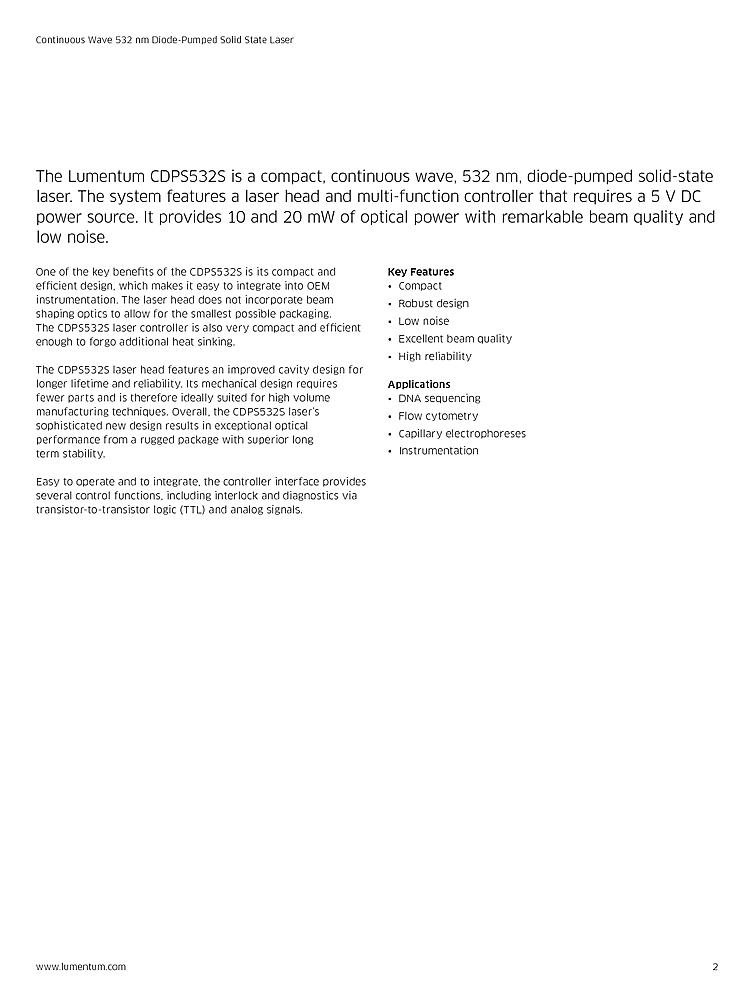 Diode pump solid state laser from Lumentum with a compact robust design with high reliability. Applications for the laser include DNA sequencing, flow cytometry, capillary electrophoreses and Instrumentation. Careful attention to design provides excellent beam quality with mode quality M2<1.3, beam divergence <8 mrad with a diameter 1.9±0.2 mm and polarization ration of >100:1. Low noise design with rms noise <0.5% over a frequency range of 20Hz to 1MHz. CW Laser with 532nm wavelength output and maximum output power of 20mW.