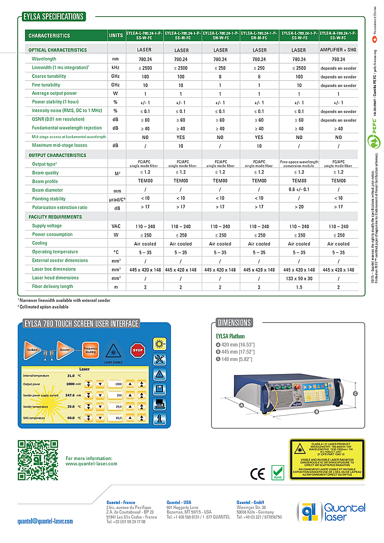 CW laser from Quantel designed for applications including atom cooling and trapping, biotechnology, and petawatt laser aligning beam. Key features include single frequency operation, single mode output with M2<1.2, wavelength locking capability, high stability over vibration and temperature, reliabile industrial grade components, maintenance free, and mid-stage access narrow line width and fiber delivery options. CW Laser with output power up to 1 watt at a wavelength of 780nm.