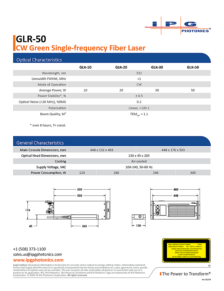 Interferometry, and Solar Cell Manufacturing. The laser can also be used in Medical Diagnostics, Therapy & Surgery or Manufacturing Inspection & Quality Control applications. Key features of the IPG CW Fiber Laser are Beam Quality M2<1.1, Single-frequency <1 MHz, Power Stability 1%, Optical Noise <0.2% RMS, Linear Polarization >100:1 and is Compact & Low Cost. Fiber laser with 50 watt output at 532nm.