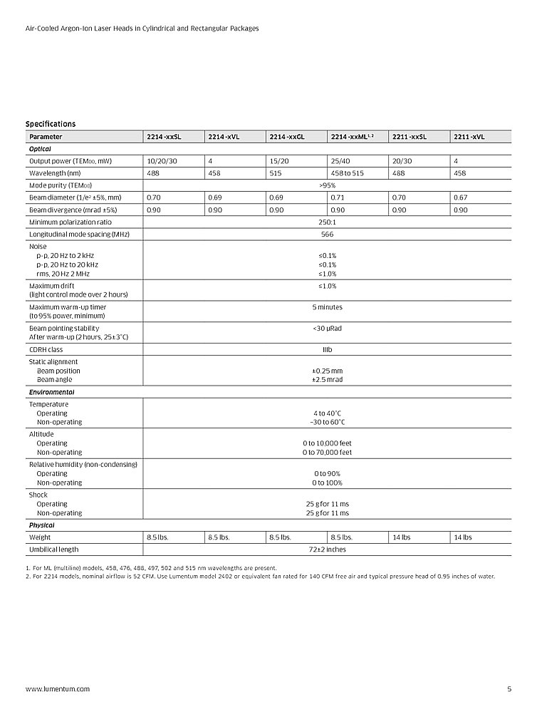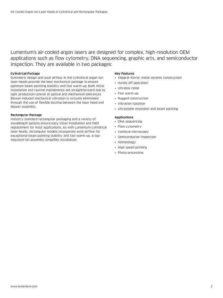 Argon CW laser form Lumentum is designed for demanding OEM applications in flow cytometry, DNA sequencing, graphic arts, and semiconductor inspection. For your OEM application two different package styles are available. Available wavelengths for the Argon laser include 458nm, 488nm, and 515nm with output power up to 40mW at 458nm or 488nm.